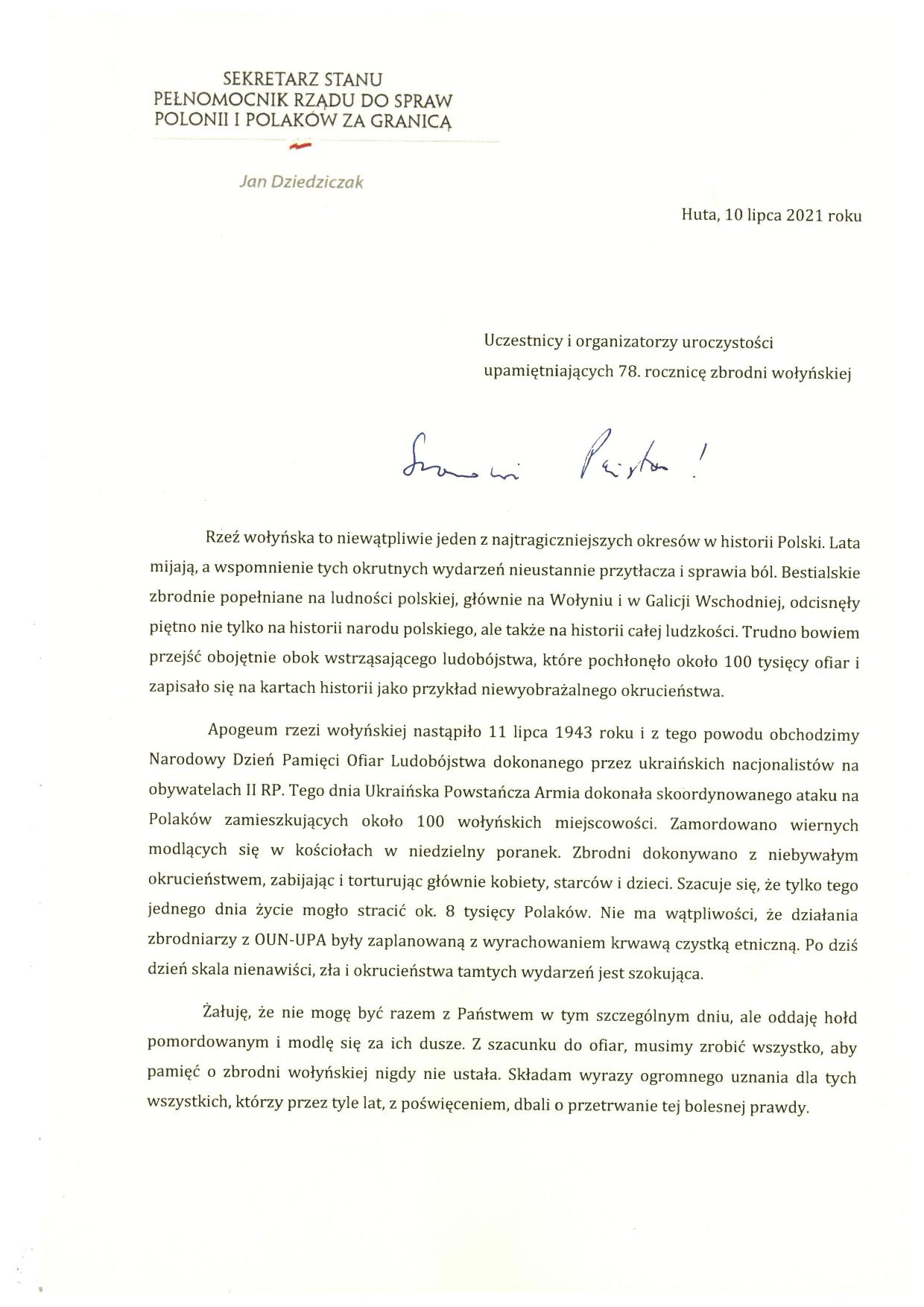 List sekretarza stanu pełnomocnika rządu do spraw polonii i Polaków za granicą Jana Dziedziczaka do uczestników i organizatorów uroczystości 78. rocznicy zbrodni wołyńskiej