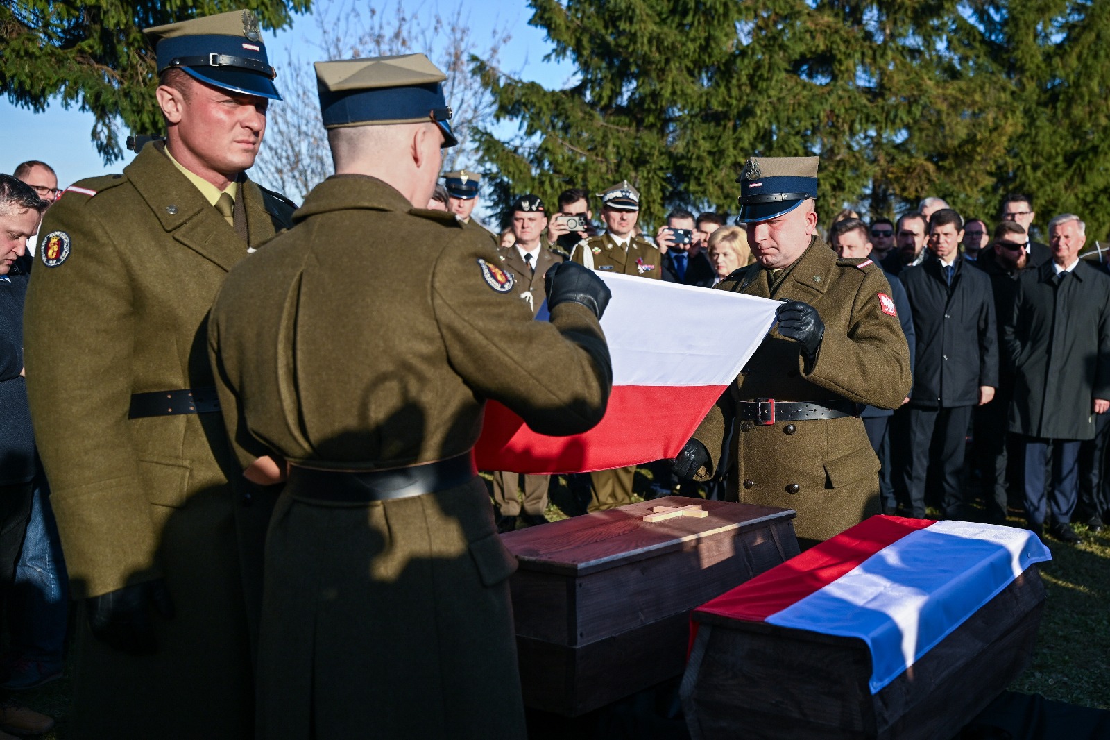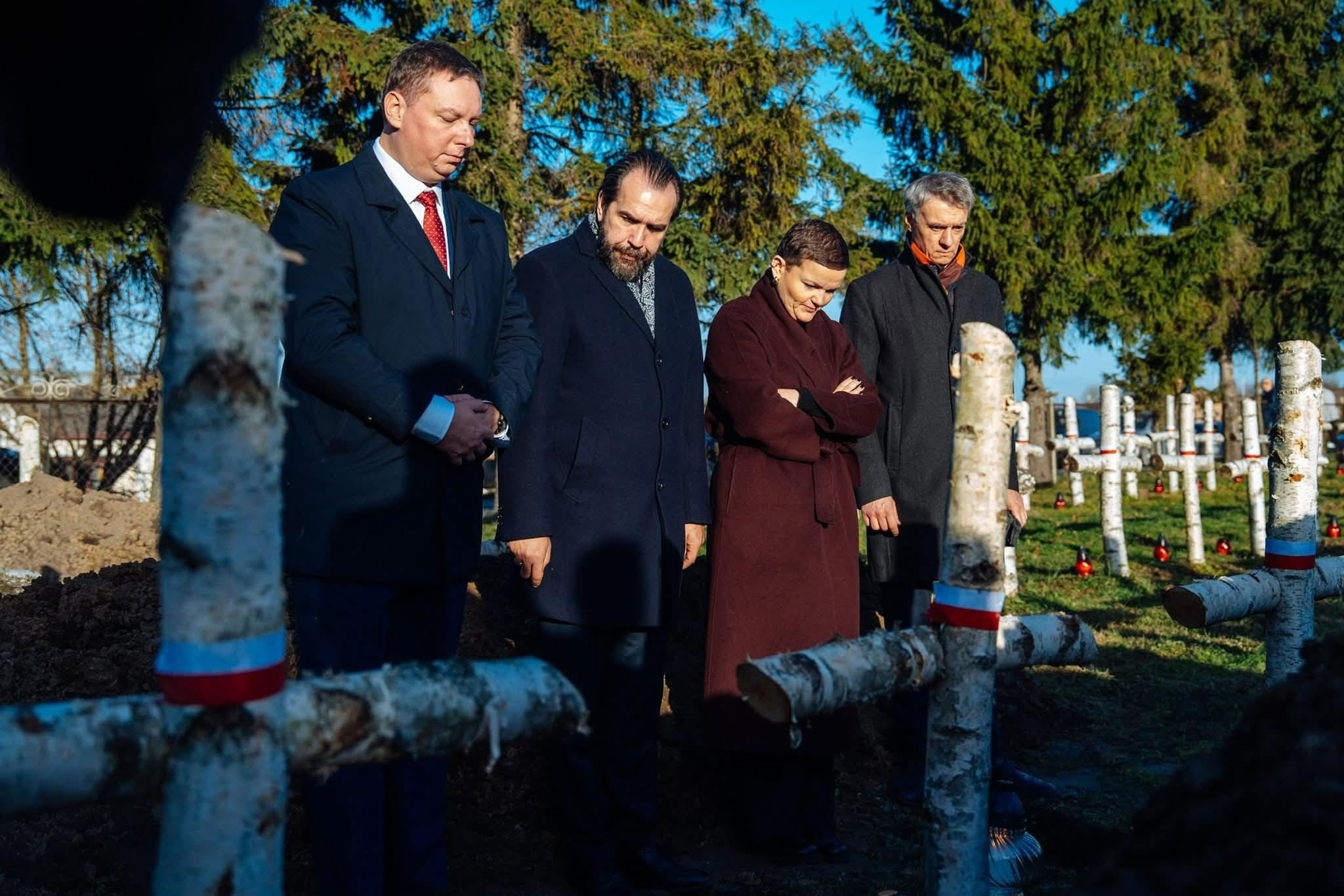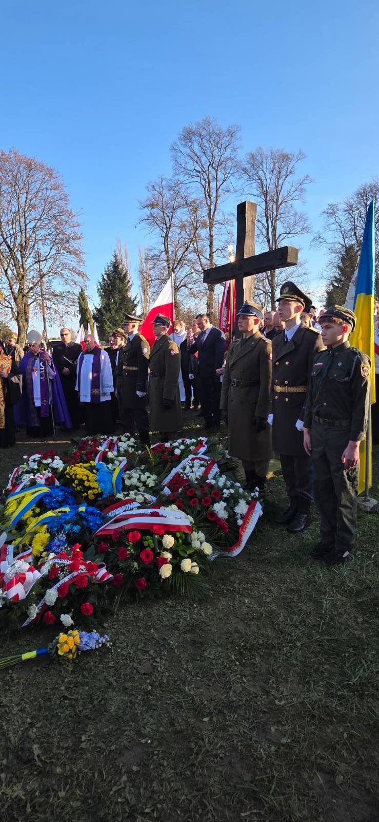Pogrzeb żołnierzy w Mościskach na Ukrainie był dla mnie osobiście bardzo wzruszający, a odnalezienie i pochowanie szczątków możliwe było dzięki zaangażowaniu wielu ludzi z: Ministerstwa Spraw Zagranicznych, Ministerstwa Kultury, Fundacji Wolność i Demokracja, Instytutu Pamięci Narodowej oraz ich ukraińskich odpowiedników. Wspaniały przykład współpracy polsko ukraińskiej oraz świadectwo tego, że mimo wojny od 2024 roku sprawę poszukiwań, ekshumacji i pogrzebów posuwamy do przodu” – powiedział chargé d’affaires Ambasady RP w Kijowie Piotr Łukasiewicz.