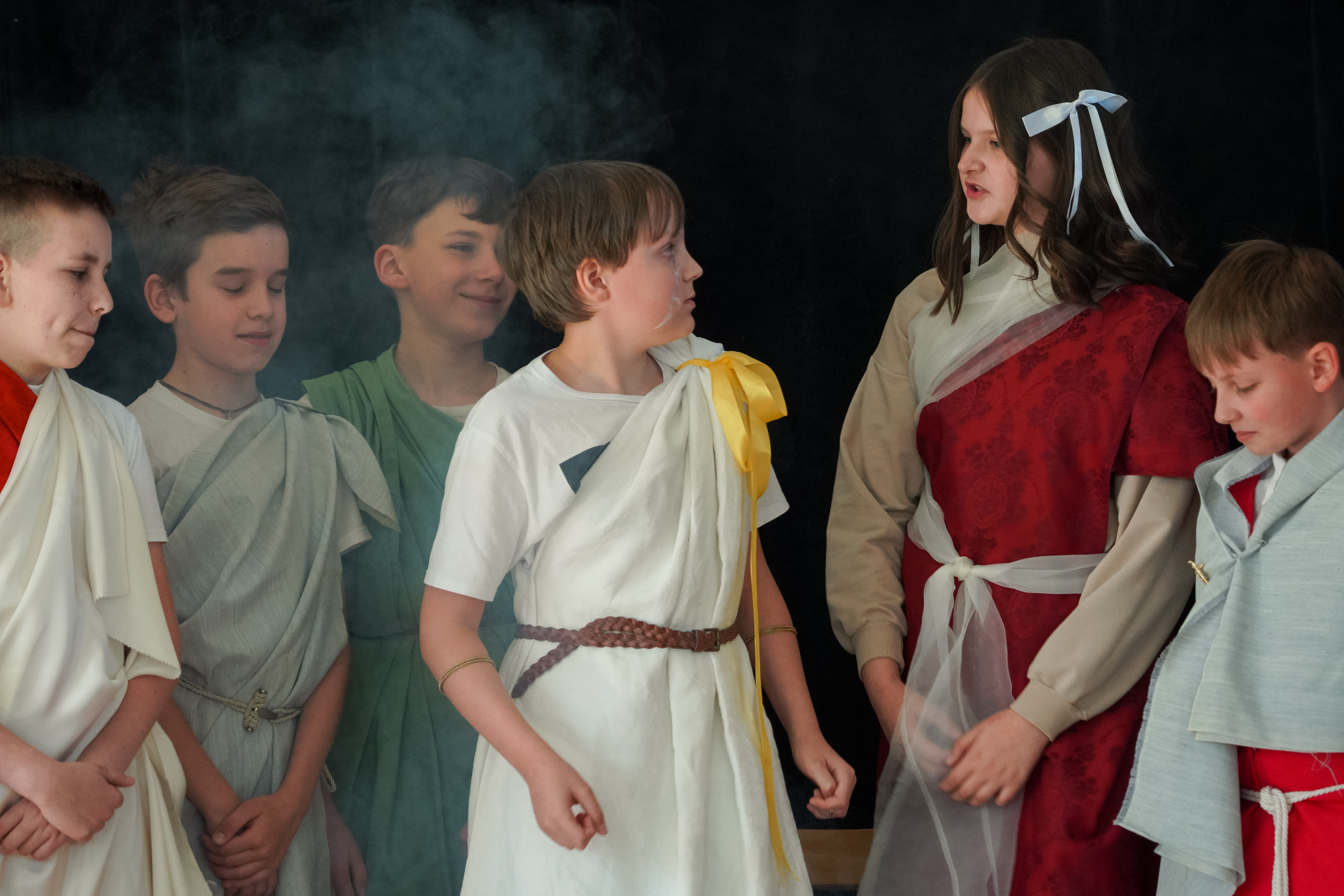 Podczas pobytu w Domu Pielgrzyma, na zaaranżowanej scenie sali kominkowej, dzieci obejrzały trzy spektakle. Jako pierwszy zaprezentował się teatrzyk ”Baj” z Liceum nr 10 im. Św. Marii Magdaleny w przedstawieniu pt. „Z kamerą na Olimpie”, który został przygotowany przez uczniów szkoły pod kierunkiem Jakuba i Adrianny Fołtów. Jako drugi wystąpił Pan Kornel Sadowski, aktor „Teatru Miejskiego” w Gliwicach, który wykonał performens pt. „Narodziny świata według Jana Parandowskiego”.