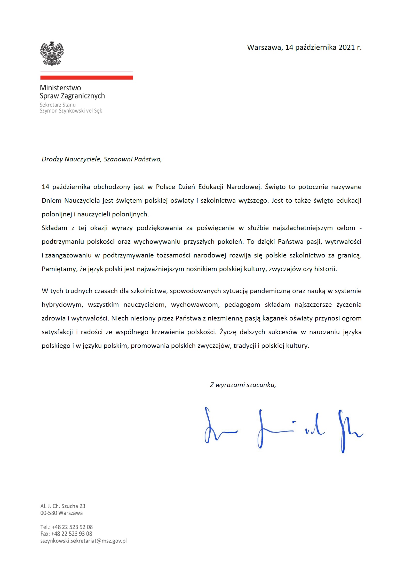 Życzenia Ministra Szymona Szynkowskiego vel Sęka z okazji Dnia Edukacji Narodowej dla nauczycieli i wychowawców prowadzących naukę języka polskiego poza granicami Polski.