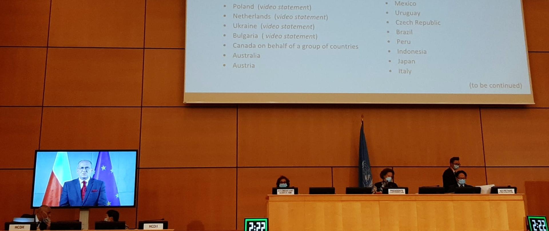 45th session of the Human Rights Council was held in Geneva from September 14 to October 7, 2020. Due to the COVID-19 pandemic, the Council was held in a "hybrid" formula that combined the physical presence of some delegates in meetings with online participation. It was the third session in which Poland participated as a member state as part of her term in the Human Rights Council in 2020-2022.