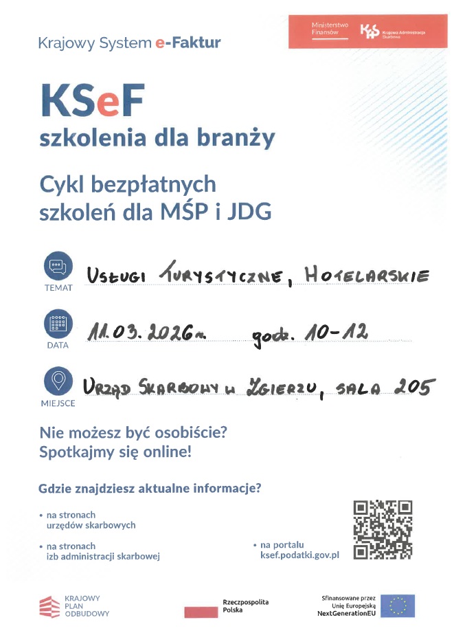 Naczelnik Urzędu Skarbowego w Zgierzu zaprasza mikroprzedsiębiorców, przedstawicieli mikroprzedsiębiorców oraz wszystkich zainteresowanych na kolejny cykl spotkań o Krajowym Systemie e-Faktur - „Środy z KSeF" – szkolenia dla branży.