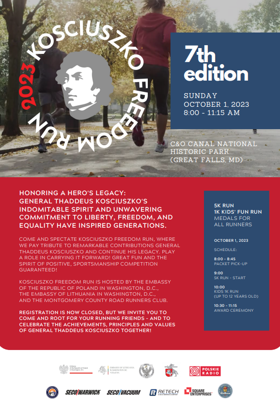 Kosciuszko Freedom Run is hosted by the Embassy of the Republic of Poland in Washington, D.C., the Embassy of Lithuania in Washington, D.C., and the Montgomery County Road Runners Club.