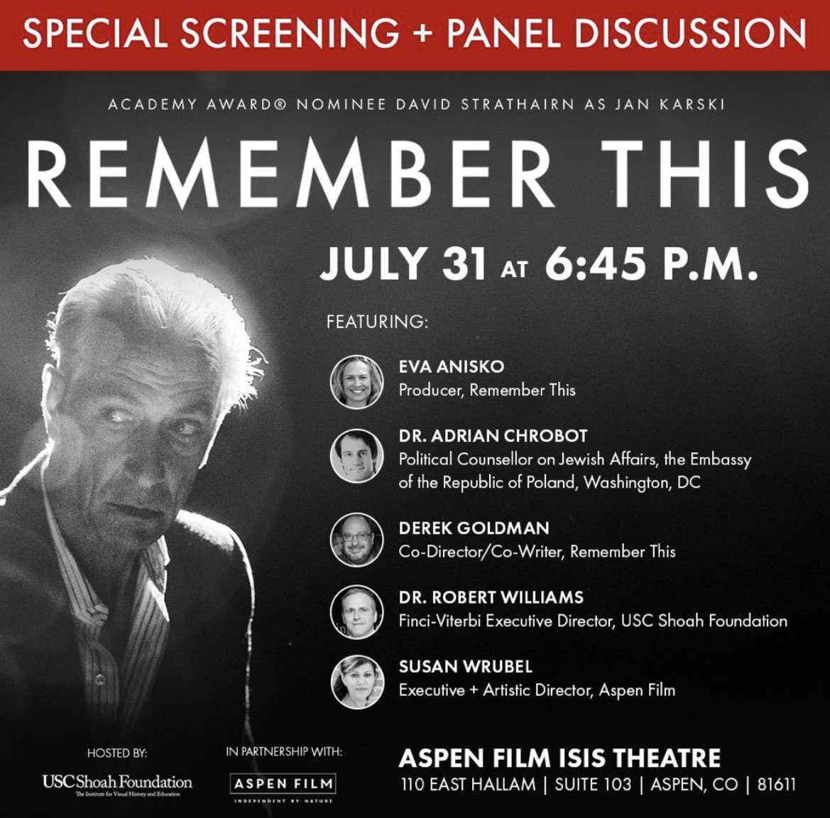 W ramach tegorocznej edycji „Summer of Cinema” w Aspen, Kolorado, odbyła się projekcja filmu o Janie Karskim pt. „Remember This”. Po prezentacji filmu organizatorzy przygotowali dyskusję panelową z udziałem Ewy Anisko, producentki filmu, Dereka Goldmana, dyrektora artystycznego i współautora filmu, Roberta Williamsa, dyrektora USC Shoah Foundation oraz dra Adriana Chrobota, pierwszego sekretarza w wydziale politycznym ambasady. Bilety na to wydarzenie zostały wyprzedane w całości, a zgromadzeni mieli okazję, aby nie tylko przybliżyć sobie historię i sylwetkę Jana Karskiego, ale również dowiedzieć się o wysiłkach Państwa Polskiego na rzecz ratowania Żydów oraz o historii Polski w XX wieku. Twórcy sztuki i filmu opowiedzieli również o początkach projektu, który zrodził się podczas realizacji inicjatywy Uniwersytetu Georgetown, zatytułowanej "Bearing Witness: The Legacy of Jan Karski Today".