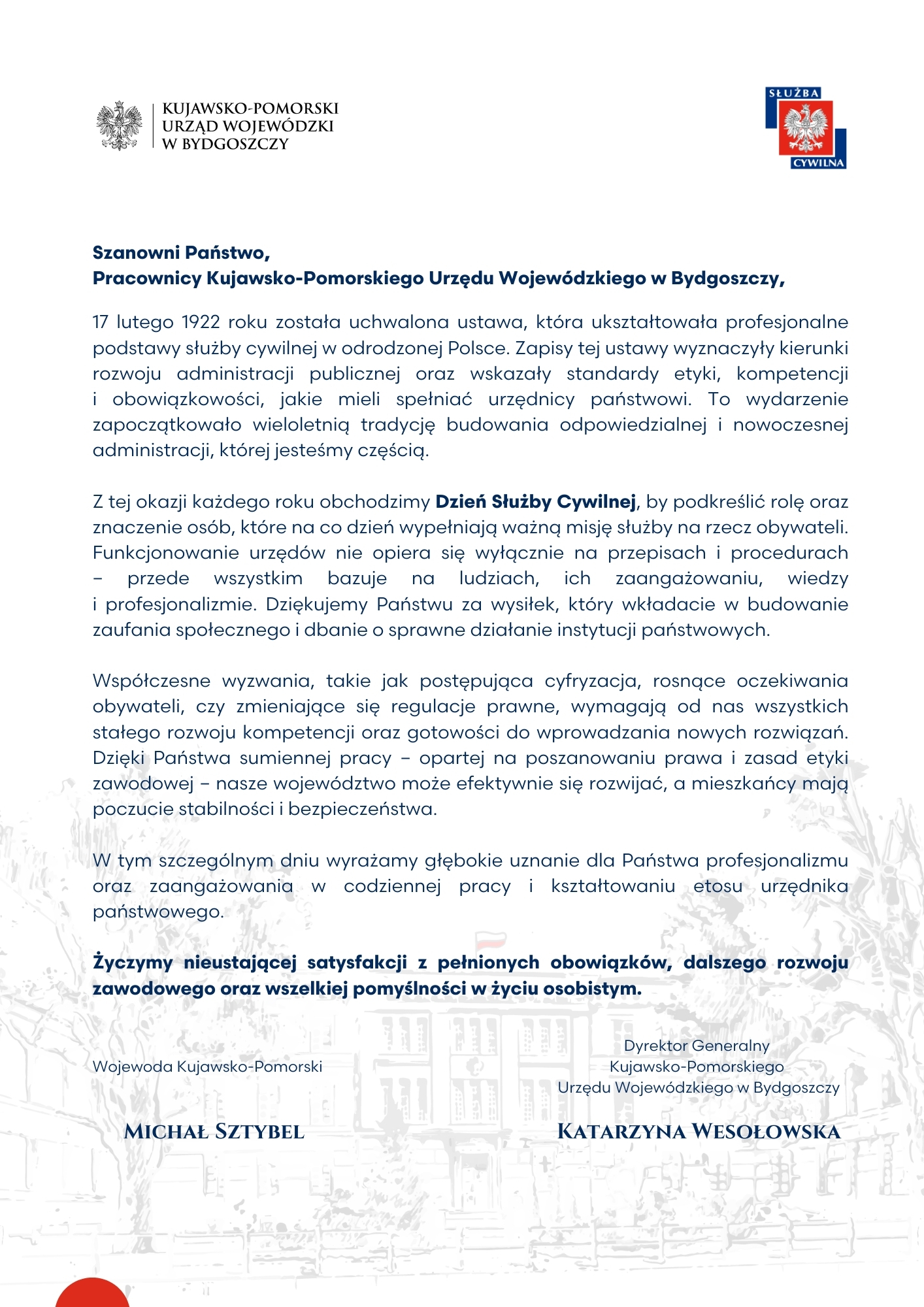 W tym szczególnym dniu wyrażamy głębokie uznanie dla Państwa profesjonalizmu oraz zaangażowania w codziennej pracy i kształtowaniu etosu urzędnika państwowego.