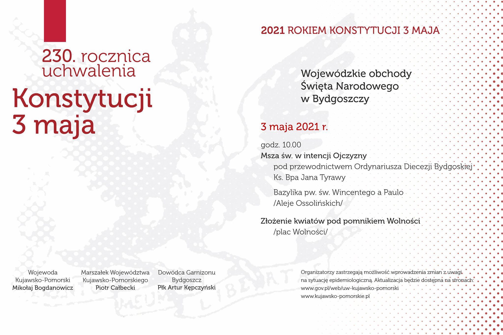 Ze względu na pandemię, program obchodów wojewódzkich został ograniczony jedynie do dwóch wydarzeń. O godz. 10.00 w Bazylice pw. św. Wincentego á Paulo odprawiona zostanie Msza św. w intencji Ojczyny pod przewodnictwem Ordynariusza Diecezji Bydgoskiej Ks. Bpa Jana Tyrawy. Po nabożeństwie złożone będą kwiaty pod pomnikiem Wolności.