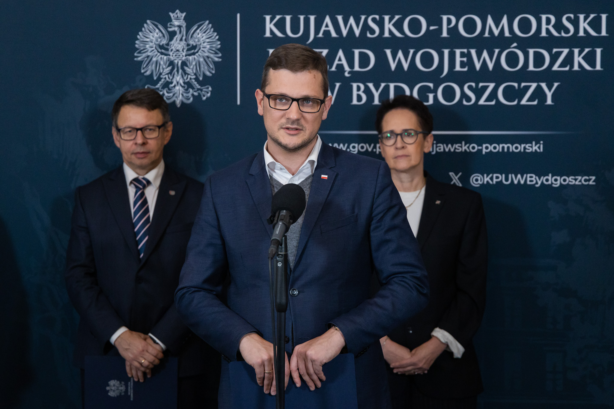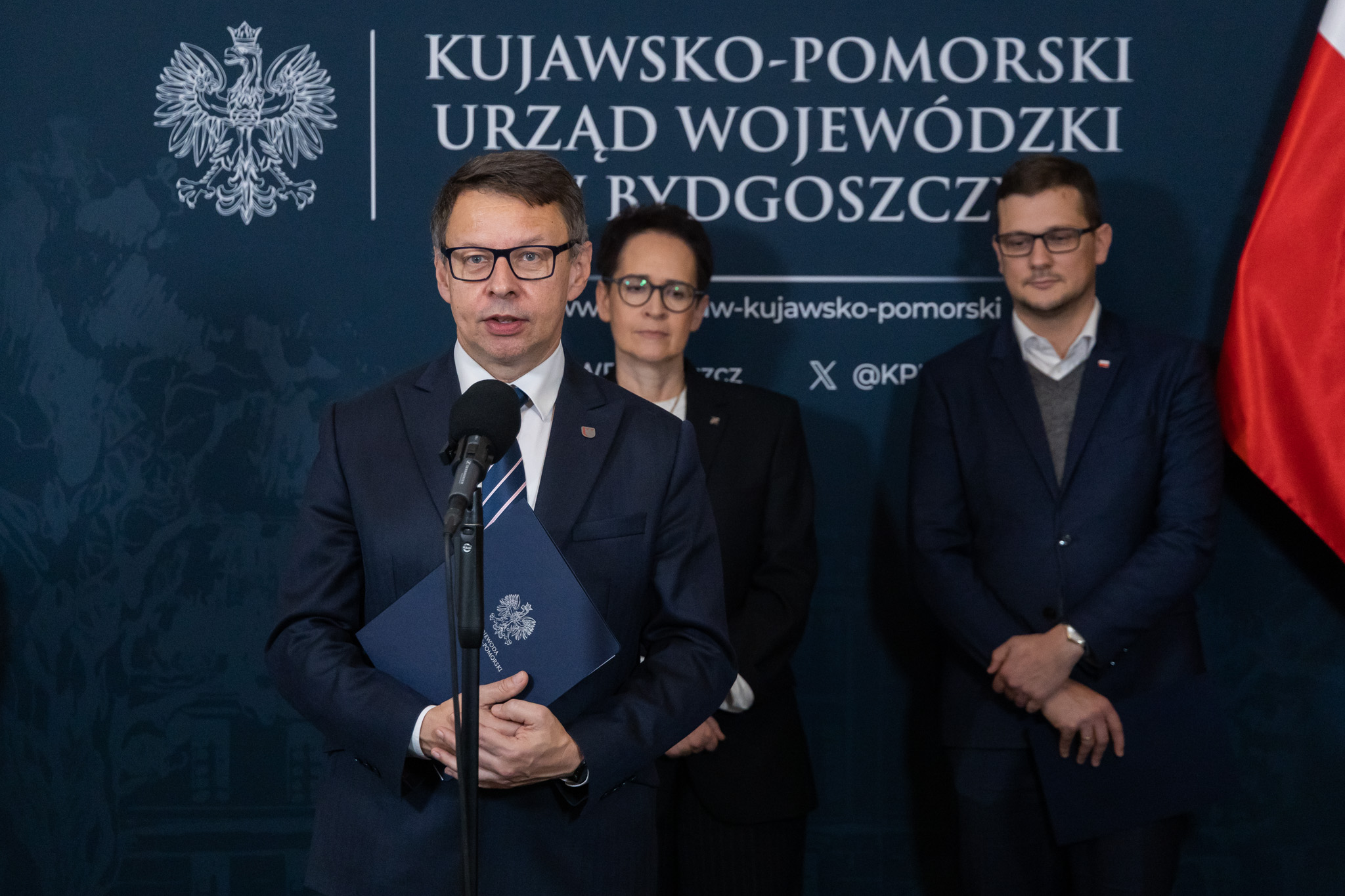 Wojewoda Michał Sztybel podczas konferencji prasowej podkreślał zaangażowanie Kujawsko-Pomorskiego Urzędu Wojewódzkiego w promowanie służby cywilnej.
