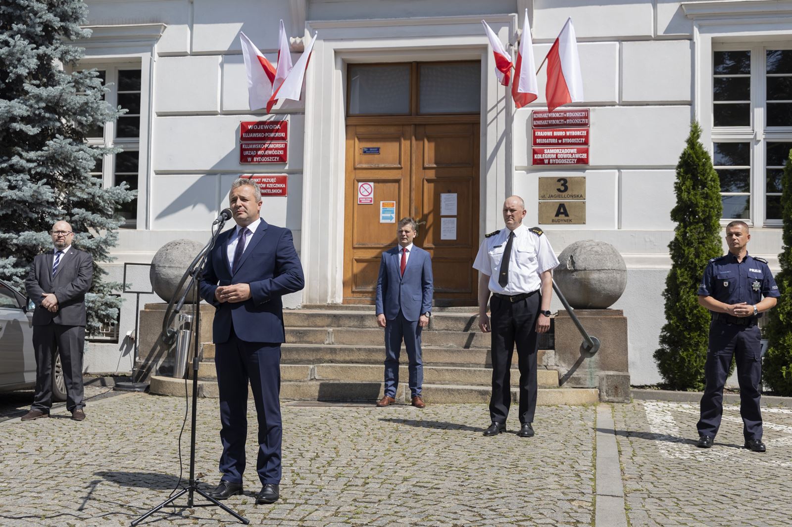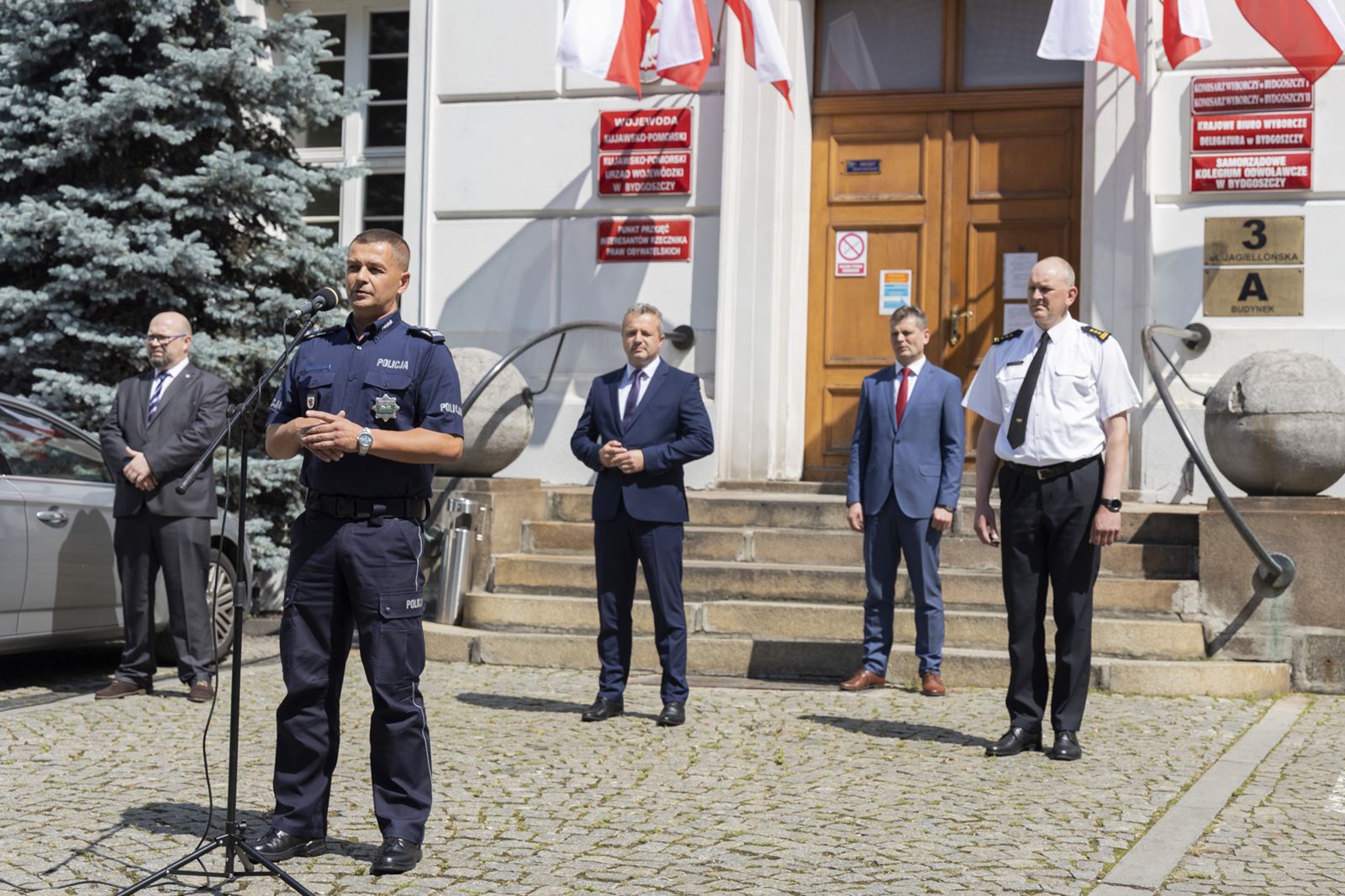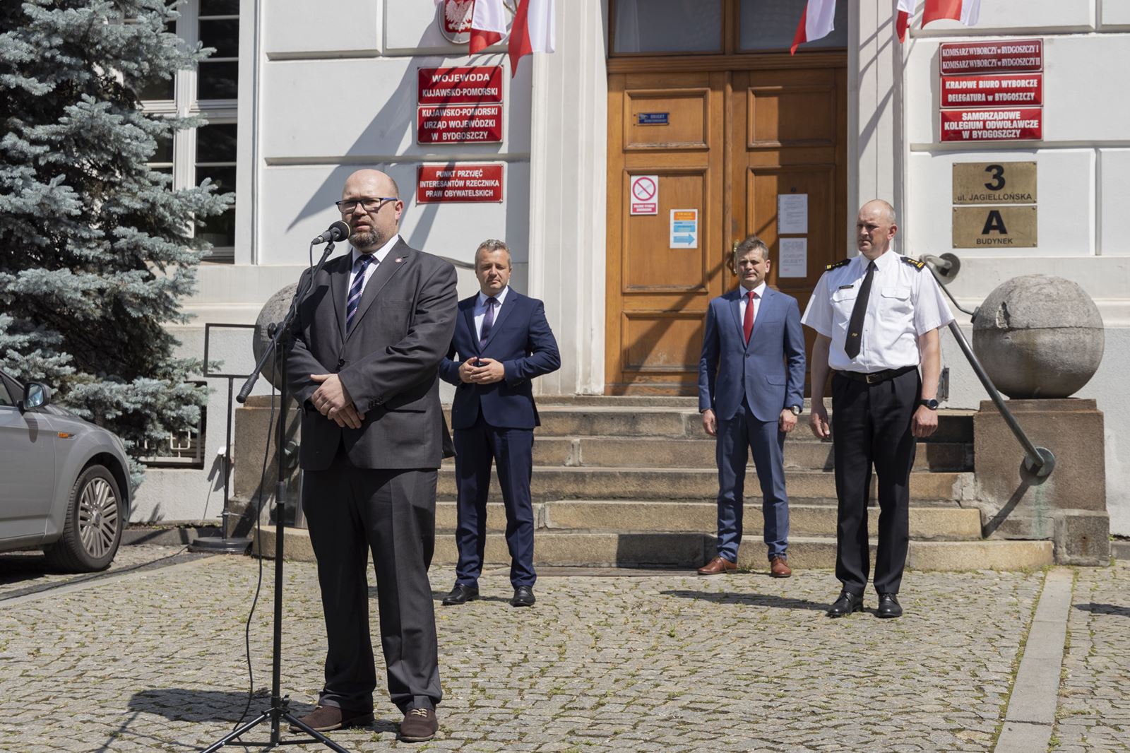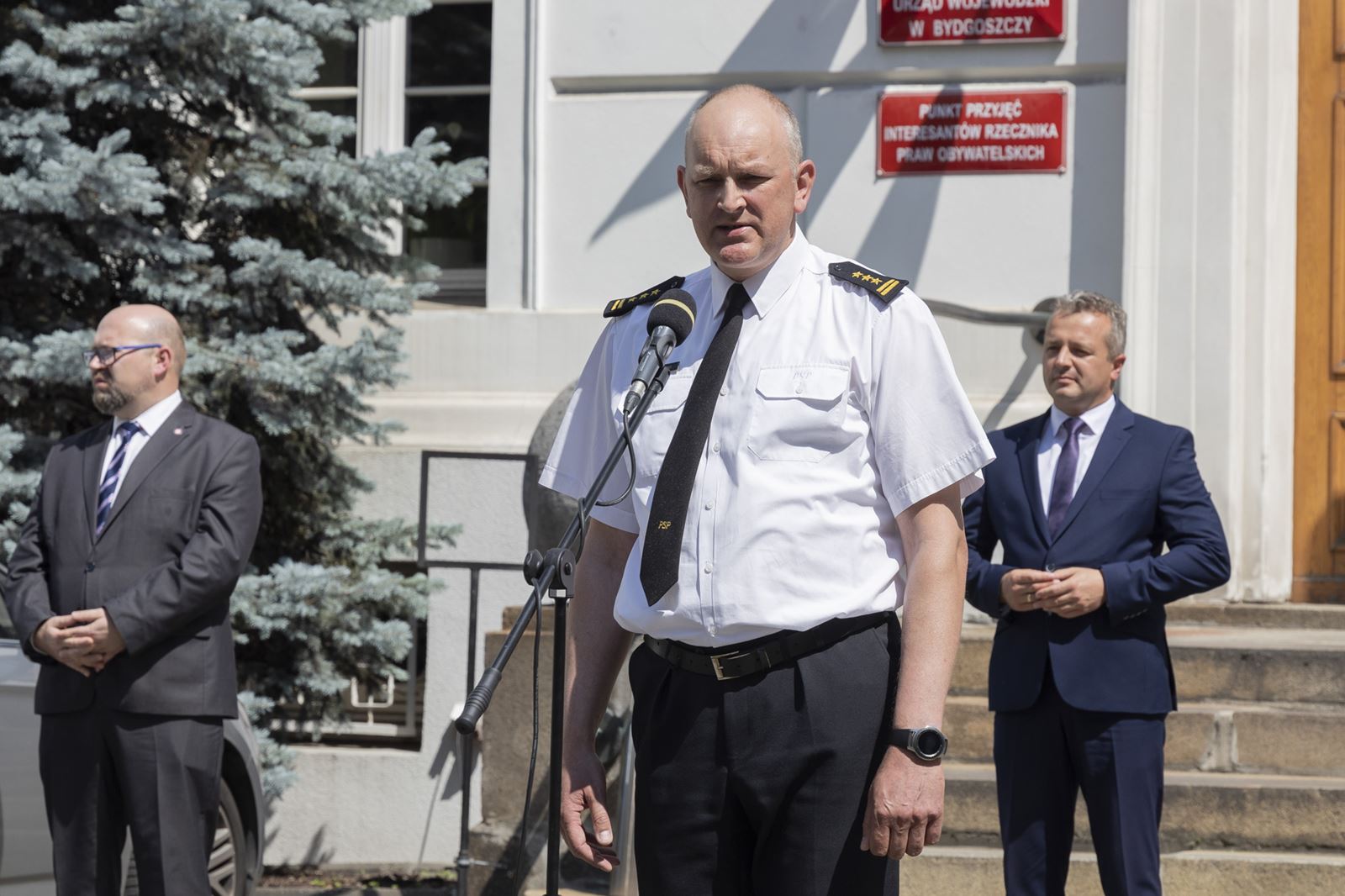 O celach i formach podejmowanych działań profilaktyczno-prewencyjnych zmierzających do zapewnienia bezpiecznego wypoczynku dzieci, młodzieży oraz osób dorosłych w czasie wolnym od pracy i szkoły, podczas konferencji prasowej poinformowali: Wojewoda Kujawsko-Pomorski Mikołaj Bogdanowicz, Pierwszy Zastępca Komendanta Wojewódzkiego Policji w Bydgoszczy insp. Mirosław Elszkowski, Kujawsko-Pomorski Komendant Wojewódzki Państwowej Straży Pożarnej w Toruniu st. bryg. Sławomir Herbowski, Państwowy Wojewódzki Inspektor Sanitarny w Bydgoszczy Wojciech Koper oraz Dyrektor Wydziału Bezpieczeństwa i Zarządzania Kryzysowego KPUW Rafał Rewoliński.