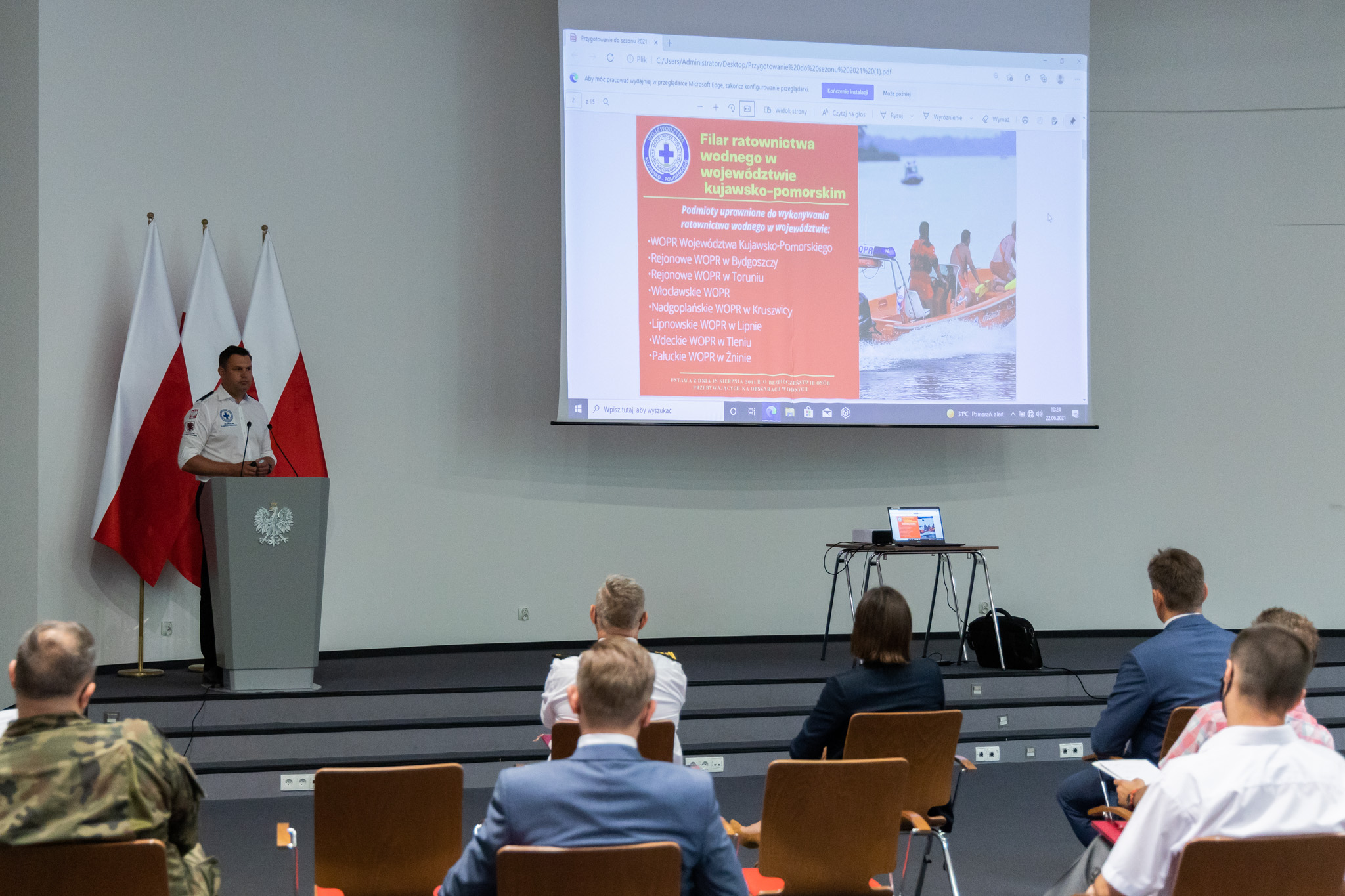 Wojewoda Mikołaj Bogdanowicz spotkał się dziś ze służbami odpowiedzialnym za bezpieczeństwo mieszkańców województwa podczas letniego wypoczynku. Szczególny nacisk został położony na bezpieczny wypoczynek nad wodą. W tym roku wojewoda przekazał środki na zakup doposażenia ratowników na wszystkich 39 zgłoszonych na Kujawach i Pomorzu kąpieliskach. Miejsca te zabezpieczają ratownicy kujawsko-pomorskiego WOPR, a wodę kontroluje inspekcja sanitarna.