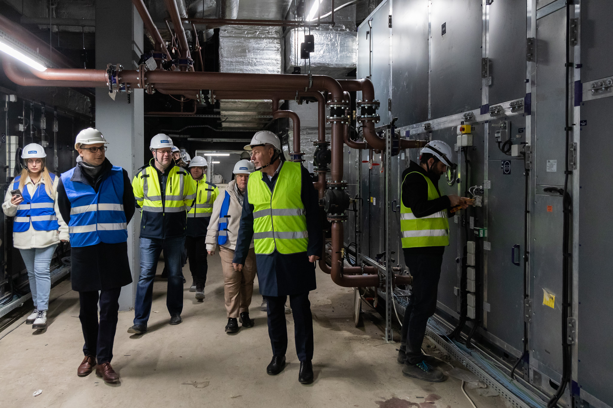 Na zewnątrz ukończono wiercenia dla sond geotermalnych, które posłużą do zasilania pomp ciepła. Dzięki temu budynek będzie zrównoważony energetycznie, co pozwoli na ekologiczne ogrzewanie zimą oraz chłodzenie latem. Kontynuowane są także prace zewnętrzne, obejmujące drogi wewnętrzne, tarasy oraz zagospodarowanie terenu wokół zbiornika wodnego. Dodatkowo, zgodnie z wytycznymi RDOŚ, trwa wymiana skażonego gruntu.