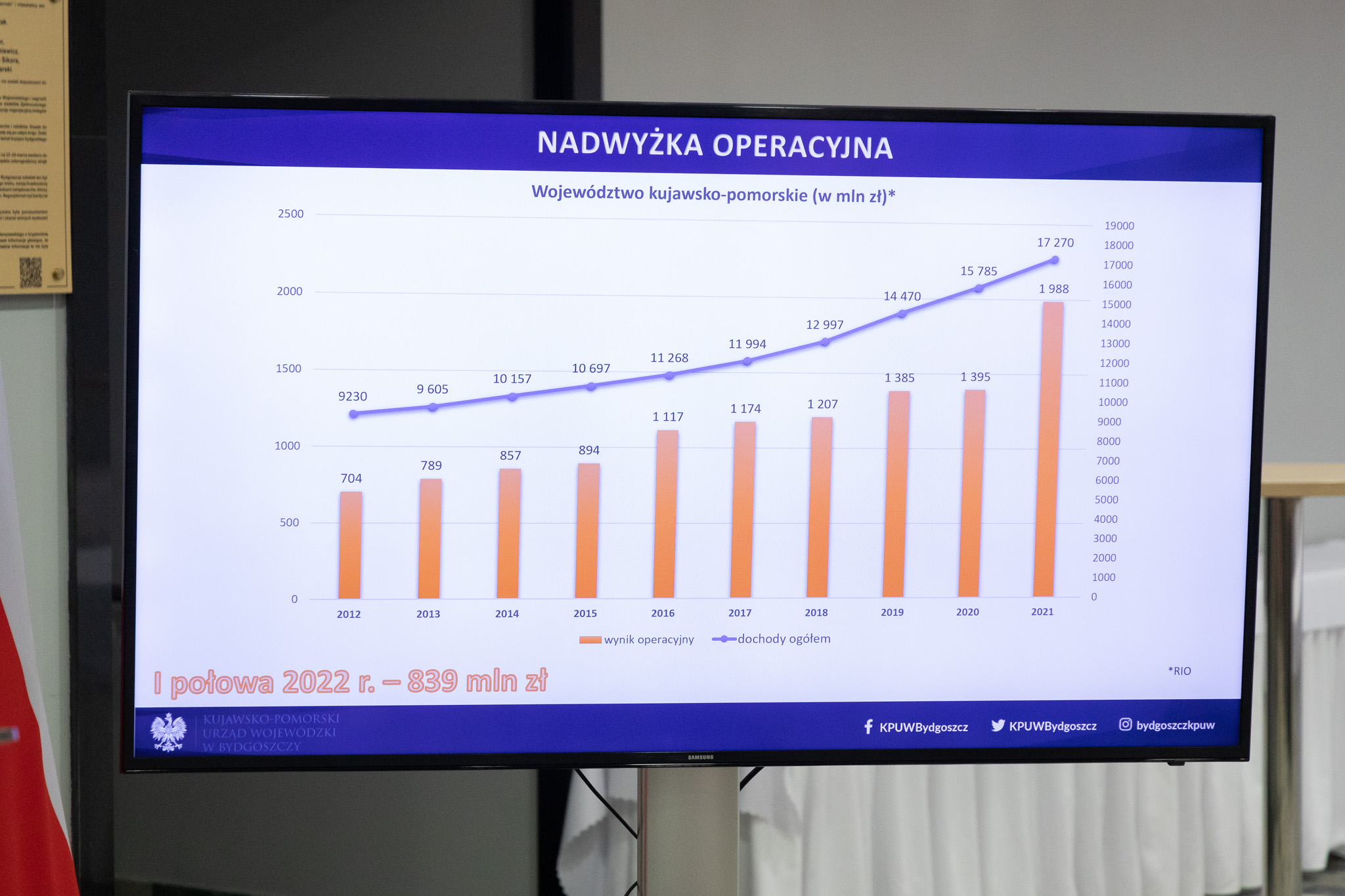 W 2012 dochody kujawsko-pomorskich samorządów wyniosły 9 mld 230 mln zł. A już w roku 2021 dochody te wyniosły 17 mld 270 mln zł. Szczególny wzrost notujemy w latach 2016-2021. W tym samym czasie, w 2021, pandemicznym roku nadwyżka operacyjna, czyli tak zwany zysk samorządów, wyniósł aż 2 mld złotych. W roku 2020 był to 1 mld 395 mln zł, w 2019 bardzo podobna kwota. W 2012 roku było to 704 mln zł, więc można powiedzieć, że w ciągu ostatnich 10 lat nadwyżka operacyjna kujawsko-pomorskich samorządów wzrosła trzykrotnie. Jest to bardzo korzystna informacja