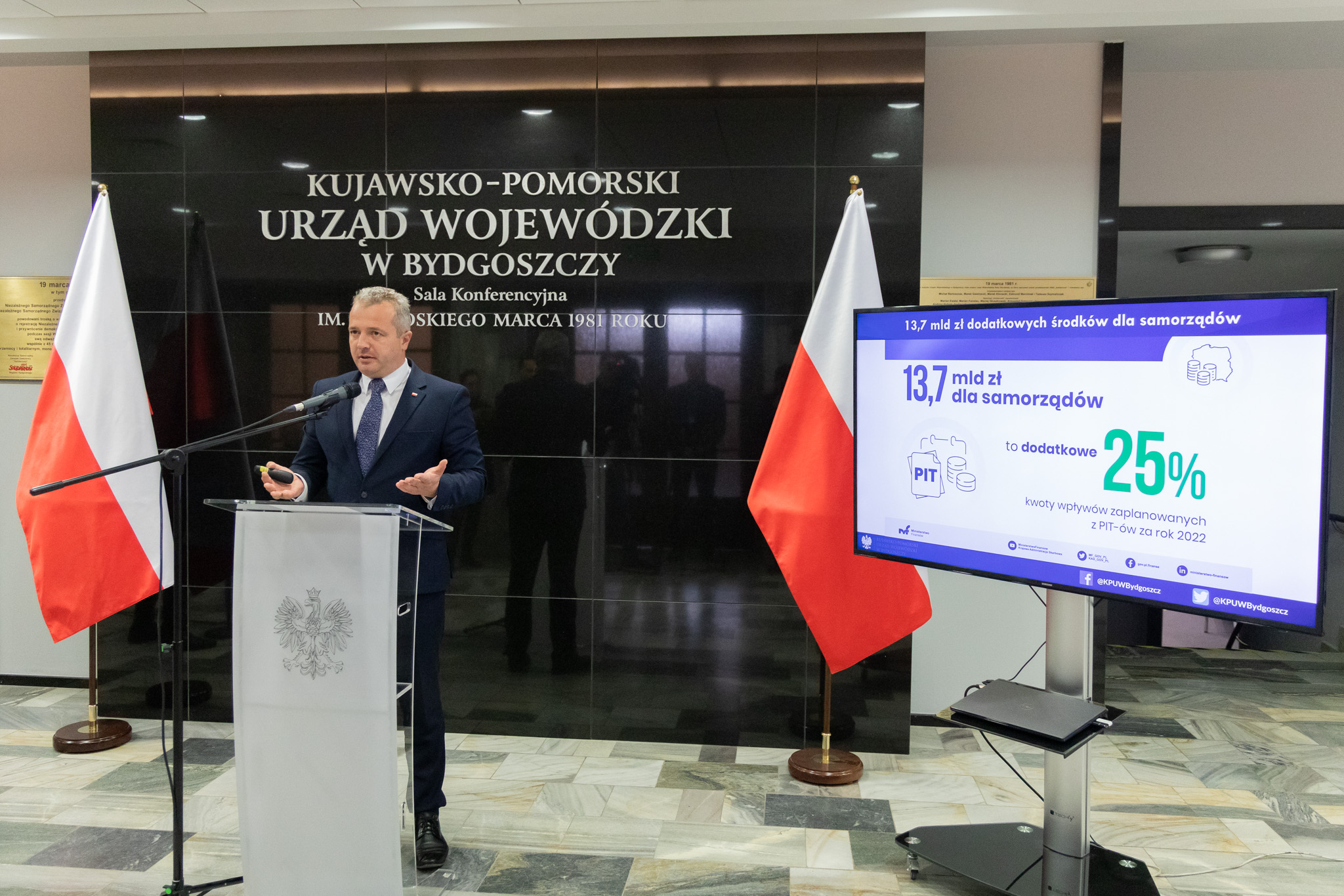 Kwota prawie 13,7 mld zł zostanie przekazana jeszcze w tym roku samorządom w całym kraju. To dodatkowe dochody z tytułu udziału we wpływach z podatku PIT. Do kujawsko-pomorskich samorządów trafi w sumie ponad 411 mln zł – poinformował na dzisiejszej konferencji prasowej wojewoda Mikołaj Bogdanowicz.