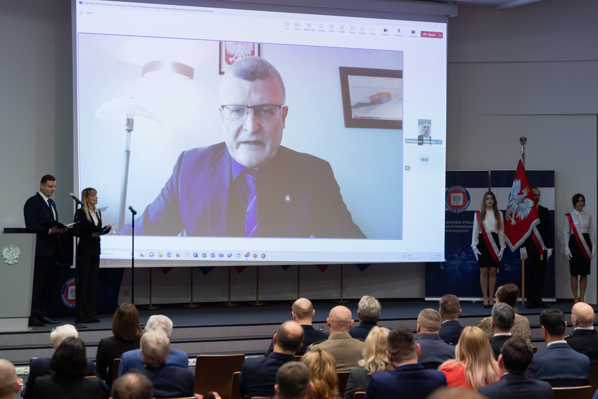 Podczas uroczystości z uczestnikami zdalnie połączył się Główny Inspektor Sanitarny dr n. med. Paweł Grzesiowski, który złożył życzenia i przypomniał o głównych wyzwaniach jakie stoją przed Inspekcja Sanitarną: