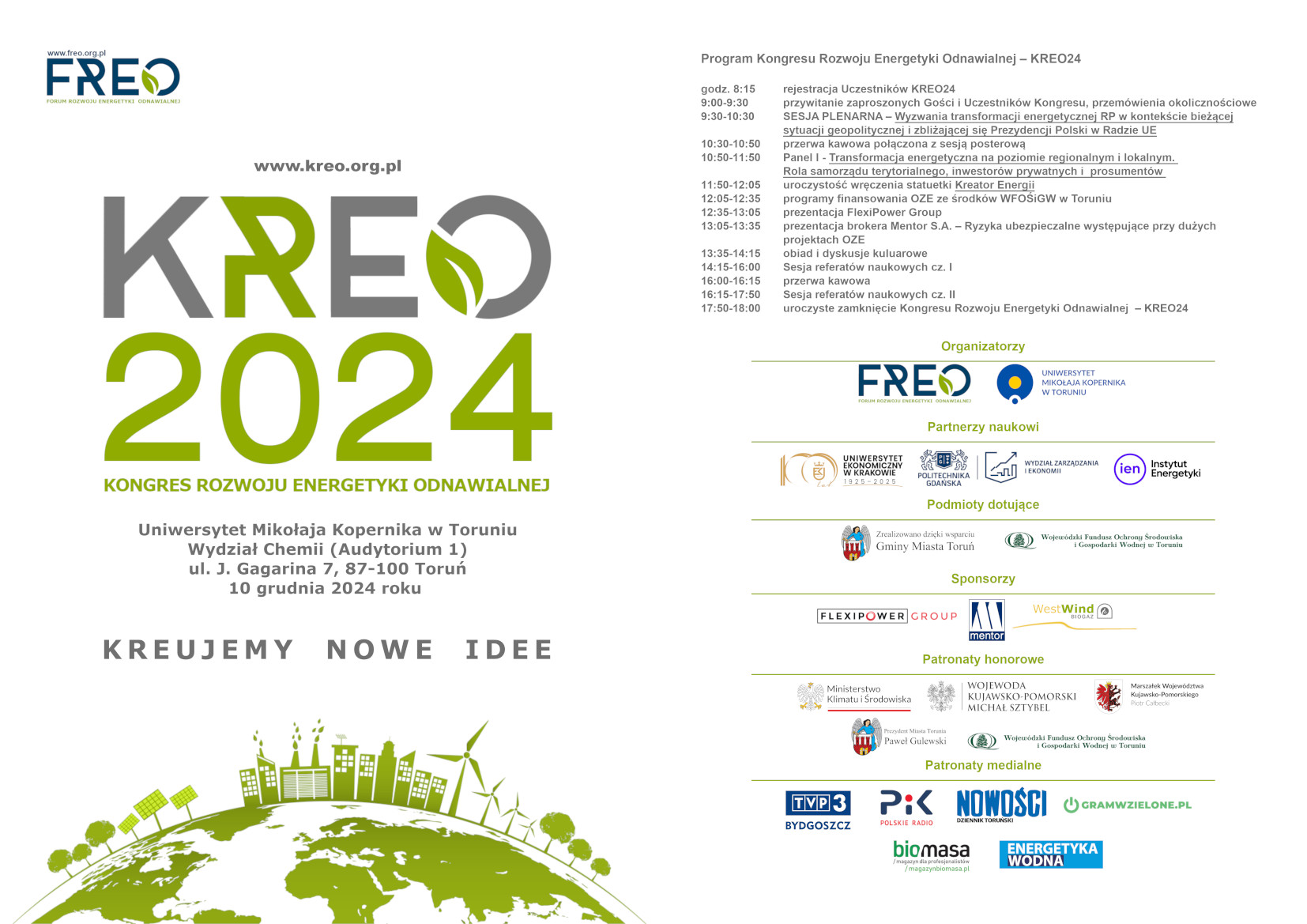 Już 10 grudnia 2024 r. na Uniwersytecie Mikołaja Kopernika w Toruniu – m.in. pod patronatem honorowym Wojewody Kujawsko-Pomorskiego – Michała Sztybla – odbędzie się Kongres Rozwoju Energetyki Odnawialnej – KREO24. Celem wydarzenia współorganizowanego przez ekspertów Forum Rozwoju Energetyki Odnawialnej i pracowników UMK, przy współudziale Wydziału Zarządzania i Ekonomii Politechniki Gdańskiej, Uniwersytetu Ekonomicznego w Krakowie oraz Instytutu Energetyki, jest integracja przedstawicieli administracji rządowej, samorządów, nauki i biznesu wokół wyzwań transformacji energetycznej RP, również w jej regionalnym czy lokalnym wymiarze.