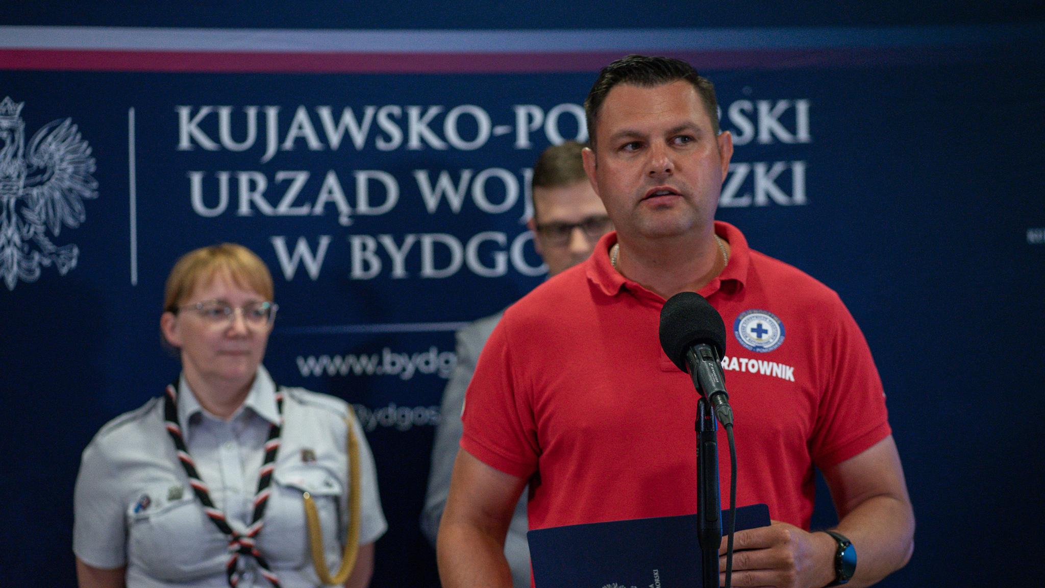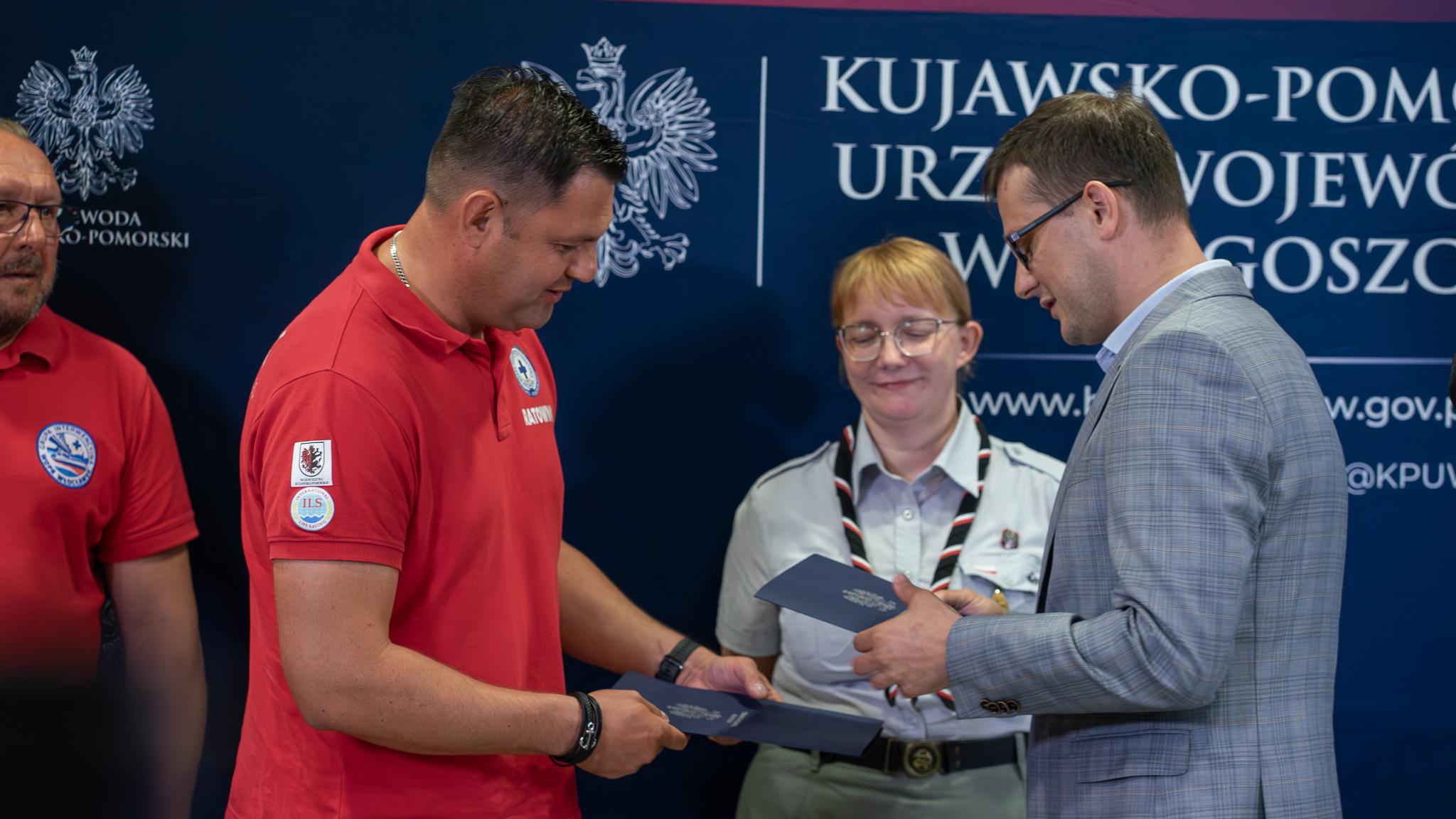Wojewoda podczas briefingu prasowego przekazał symbolicznie umowy dla przedstawicieli WOPR z województwa kujawsko-pomorskiego, które otrzymały dofinansowanie do swoich działań.