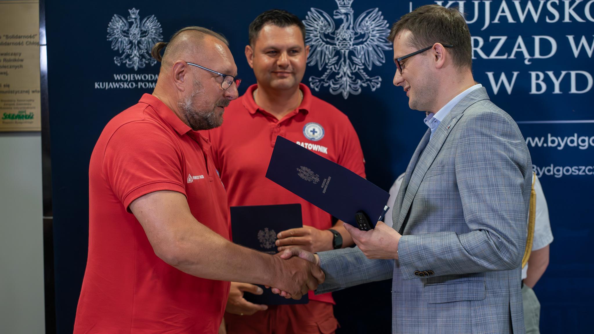 9 jednostek skorzysta ze zwiększonych do poziomu 500.000 zł środków przekazanych przez Wojewodę. Umowy odebrali: Maciej Banachowski - Prezes WOPR Województwa Kujawsko-Pomorskiego, Jarosław Wiśniewski - Wiceprezes WOPR Województwa Kujawsko-Pomorskiego oraz Sławomir Mularski – Prezes WOPR we Włocławku.