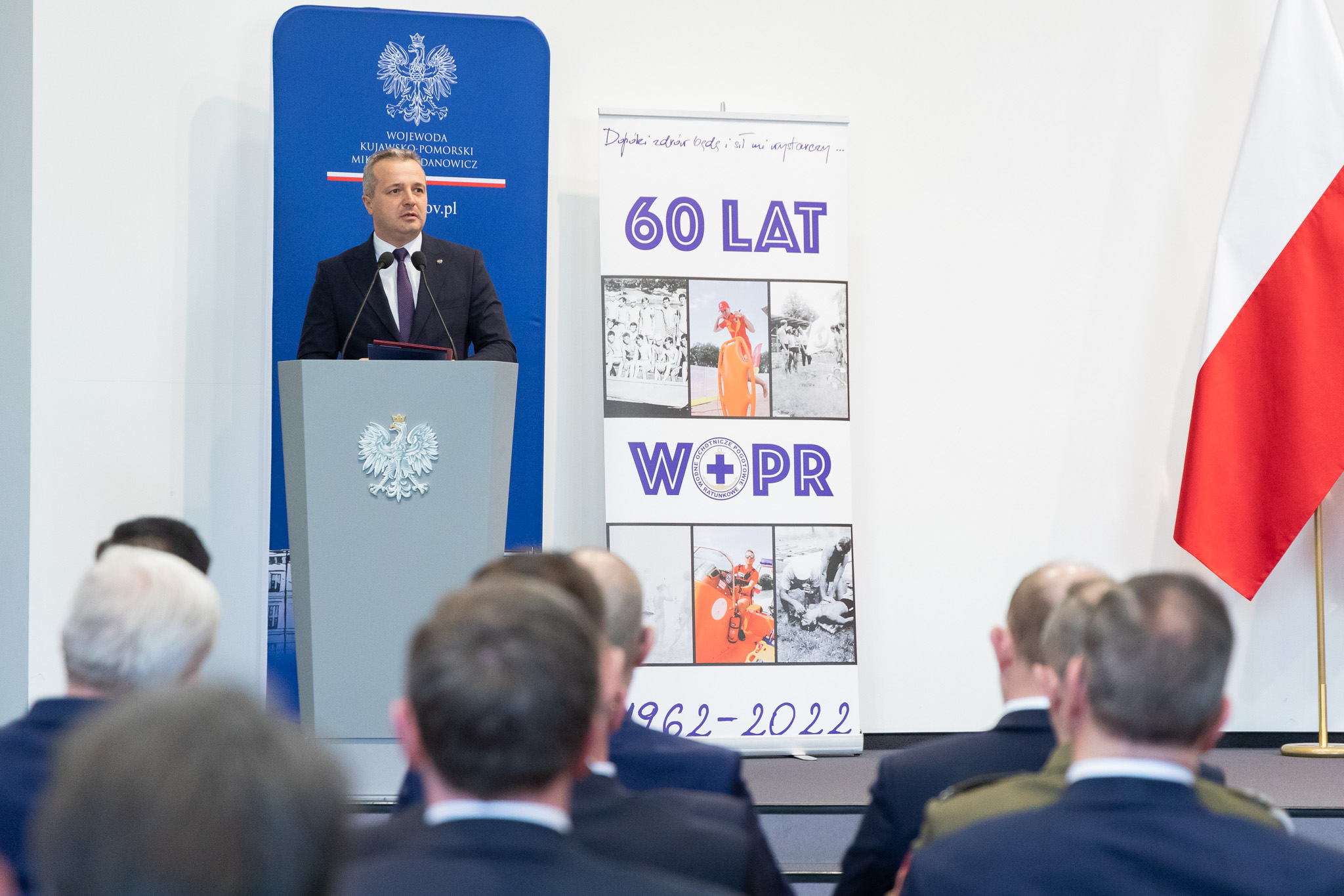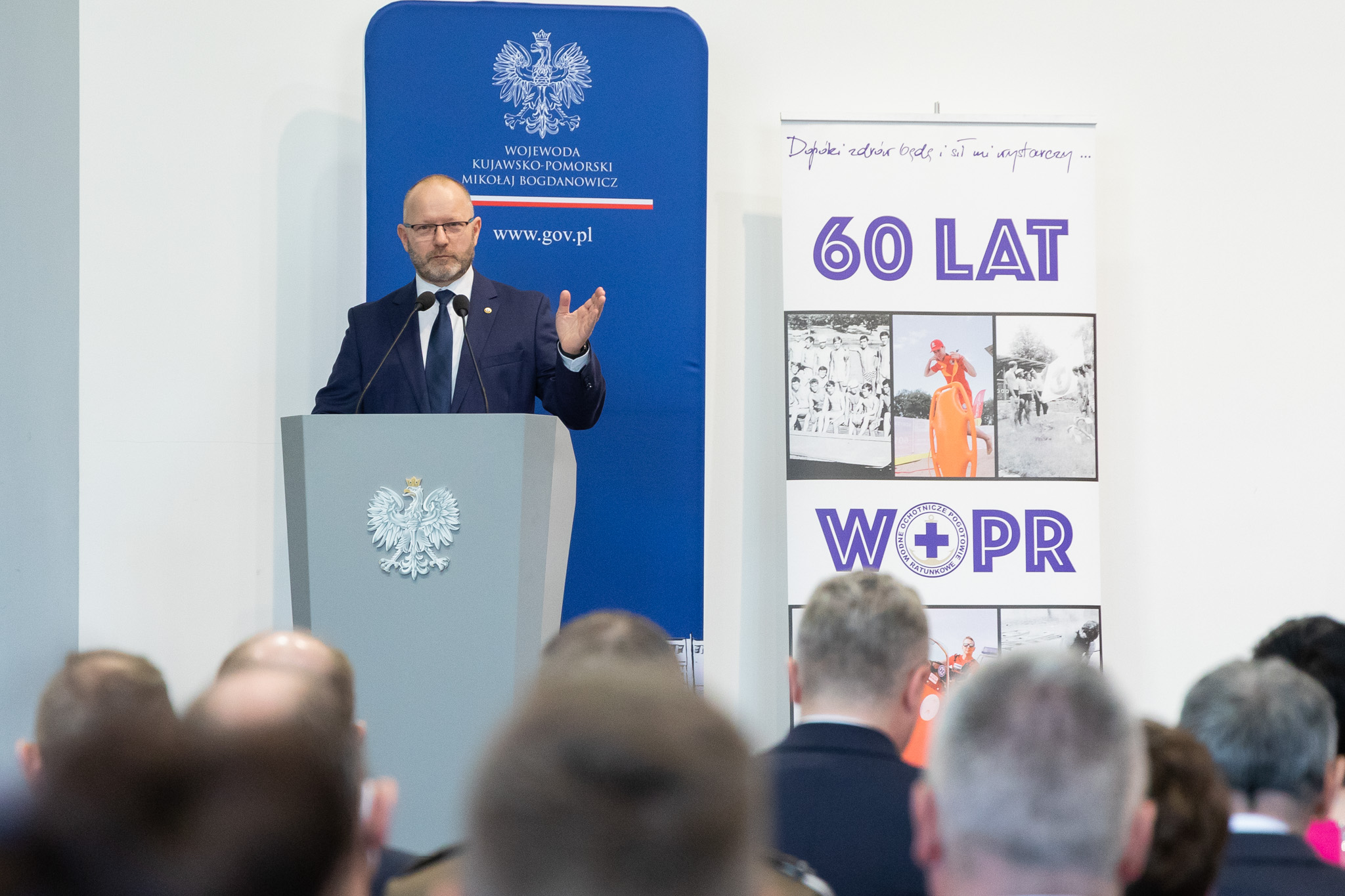 W imieniu ponad 100-tysięcznej rzeszy ratowników, którzy ryzykując własne życie ratują osoby dla nich obce, pragnę bardzo podziękować panu wojewodzie Mikołajowi Bogdanowiczowi. To dzięki jego gościnności sześćdziesiąte urodziny WOPR możemy obchodzić w siedzibie Kujawsko-Pomorskiego Urzędu Wojewódzkiego w Bydgoszczy”