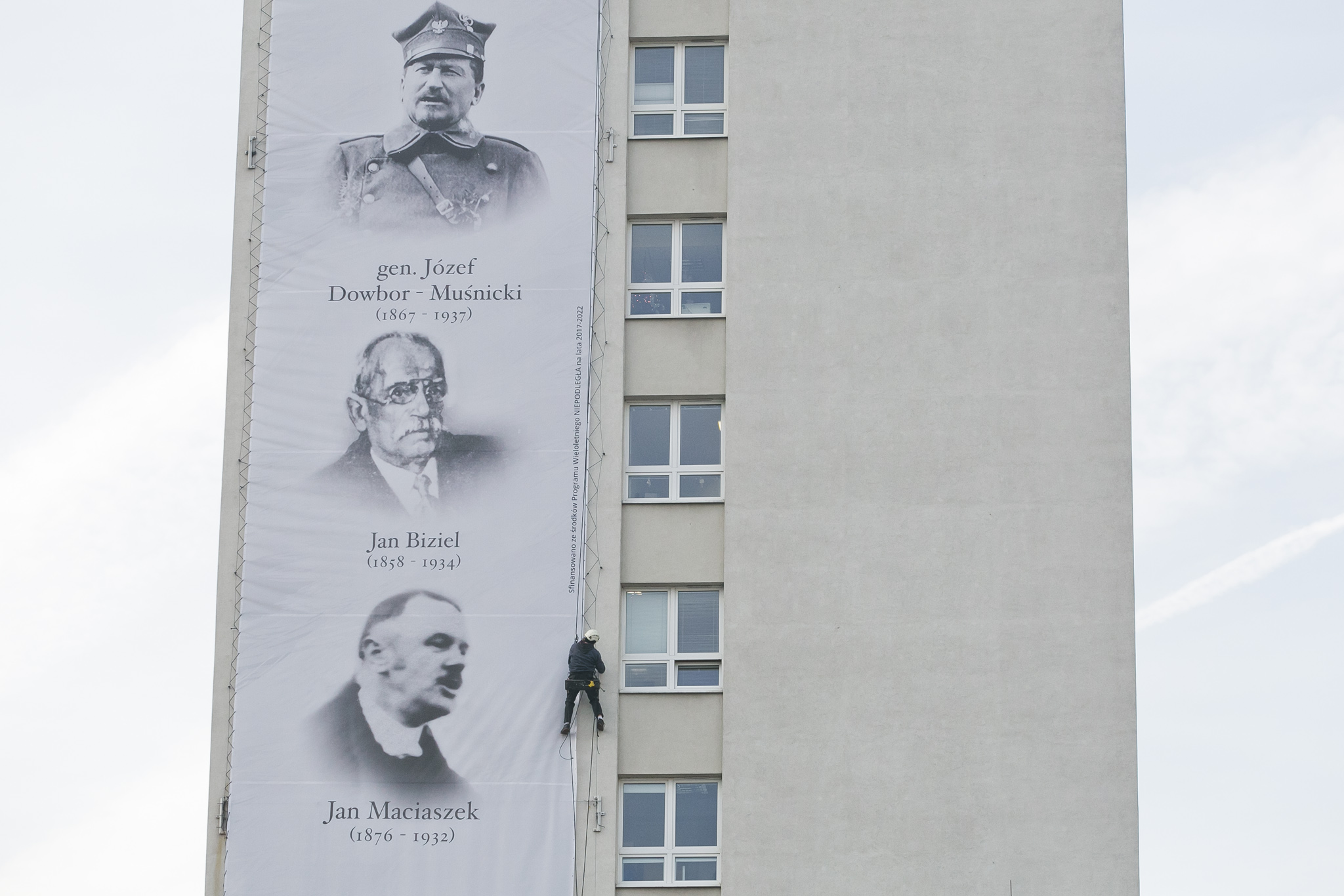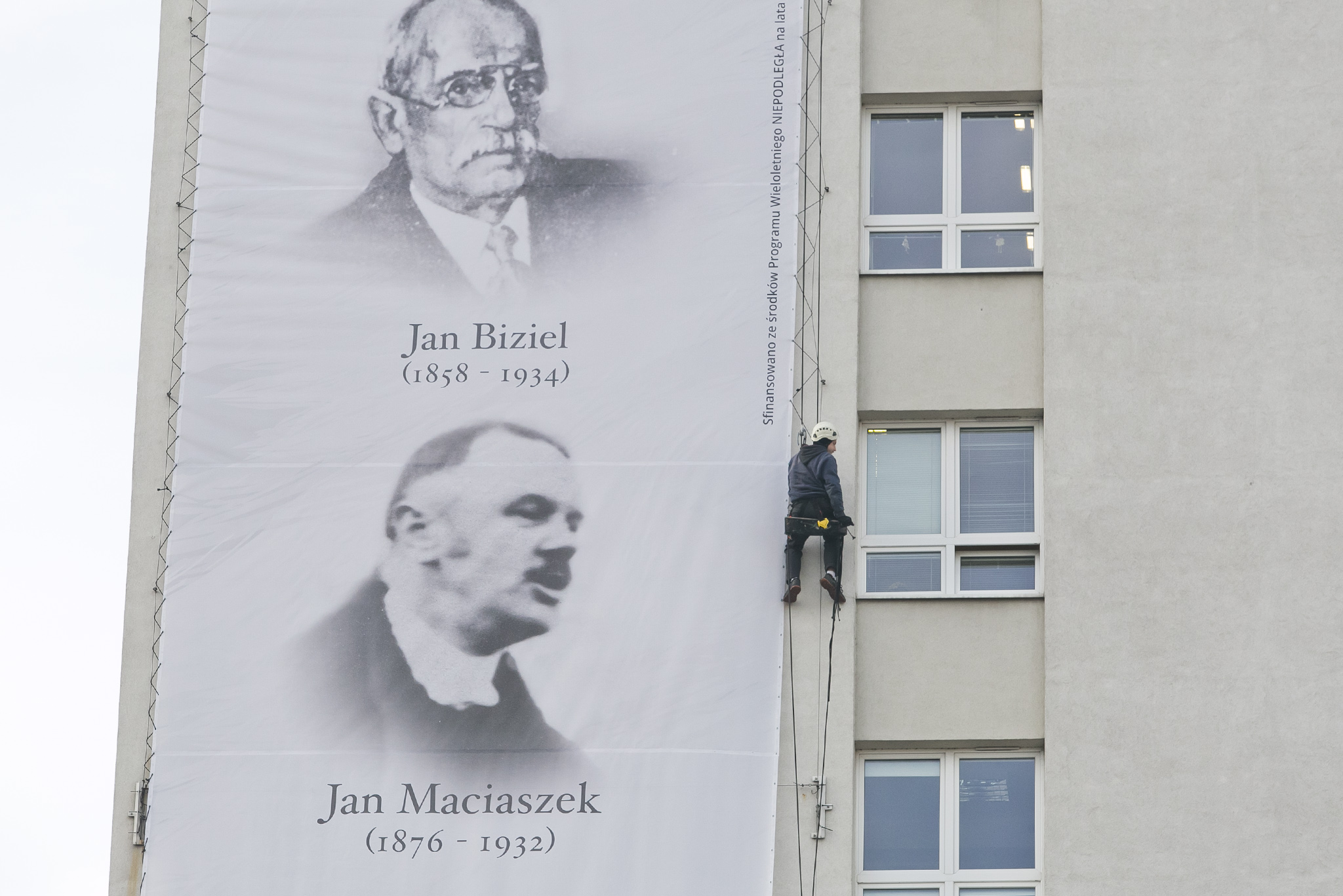 Ogromnych rozmiarów plakat przedstawia wizerunki ojców bydgoskiej niepodległości: generała Józefa Dowbor-Muśnickiego, Jana Biziela i Jana Maciaszka.
