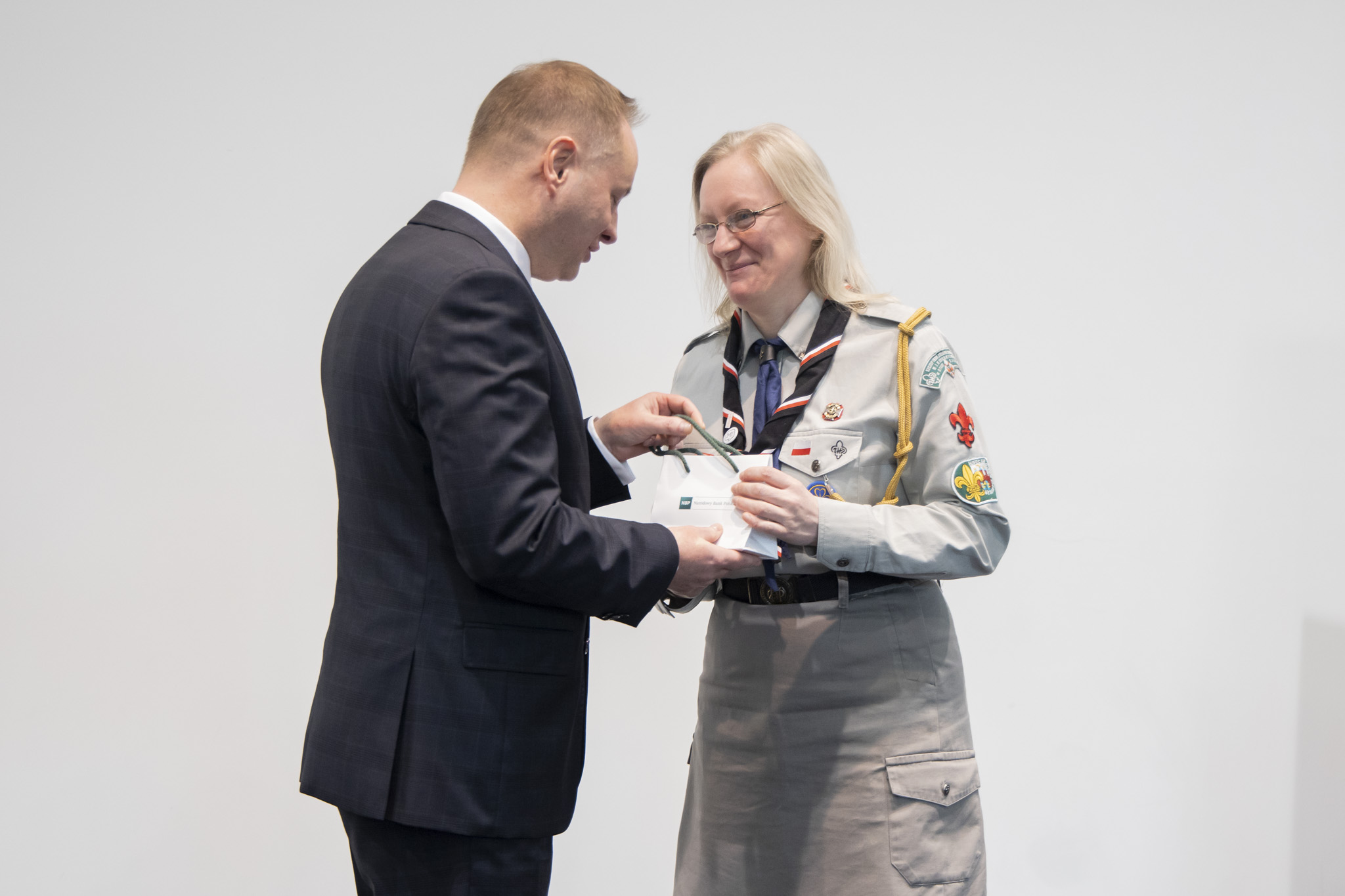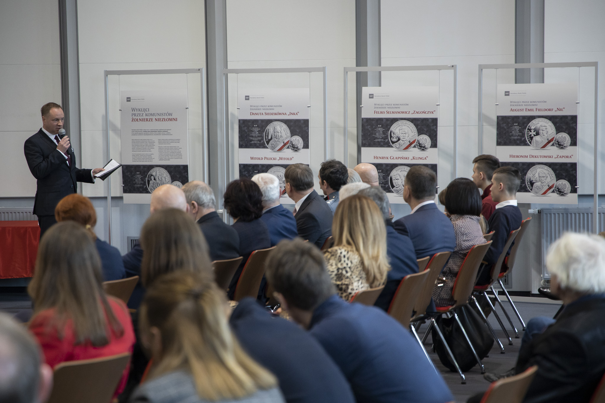 Zastępca Dyrektora Oddziału Okręgowego NBP w Bydgoszczy pan Leszek Beszczyński wręczył okolicznościową monetę wydaną przez Bank z okazji Narodowego Dnia Pamięci Żołnierzy Wyklętych organizatorom dzisiejszych uroczystości oraz 8. Kujawsko-Pomorskiej Brygadzie Obrony Terytorialnej, Chorągwi Kujawsko-Pomorskiej Związku Harcerstwa Polskiego, a także Agacie Rzosce, architekt, autorce projektu Muzeum Żołnierzy Podziemia Antykomunistycznego w Bydgoszczy.