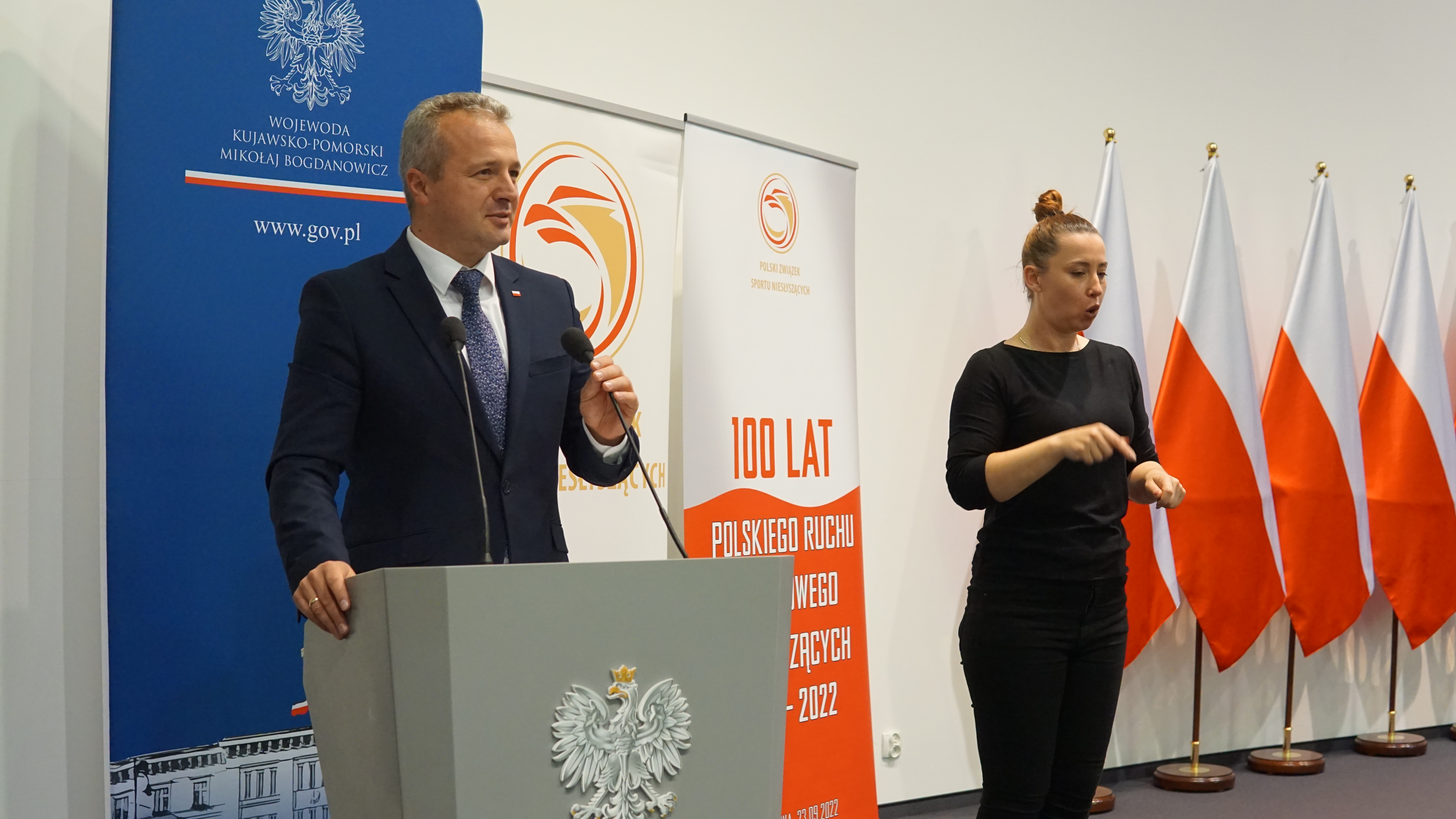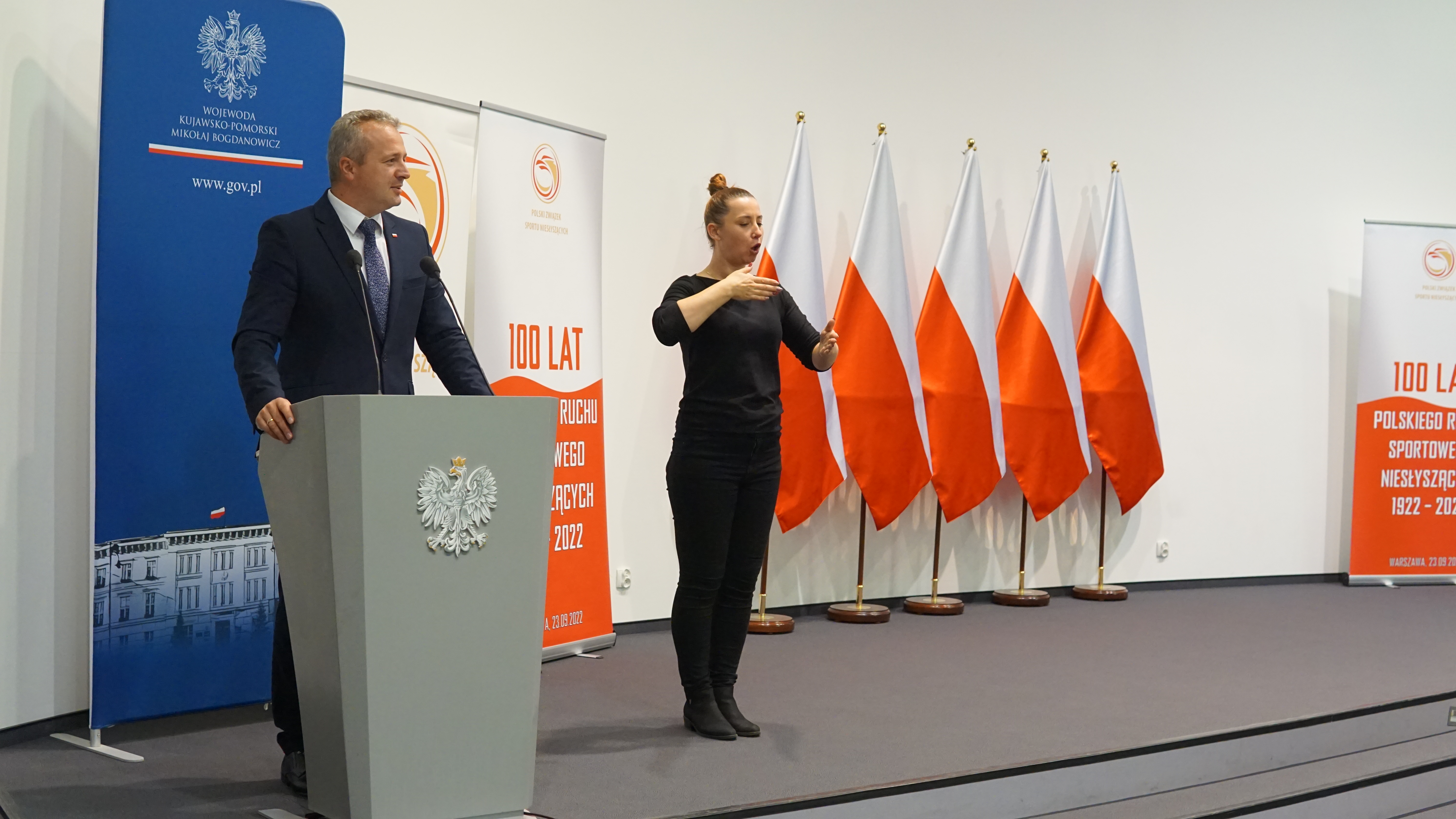 Dziś w Urzędzie Wojewódzkim odbyło się spotkanie w ramach 100-lecia Polskiego Ruchu Sportowego Niesłyszących 1922-2022 z udziałem medalistów XXIV Letnich Igrzysk Głuchych w Caxias do Sul w Brazylii. Podczas uroczystości wojewoda Mikołaj Bogdanowicz wręczył sportowcom niesłyszącym i ich trenerom medale Wojewody Kujawsko-Pomorskiego.