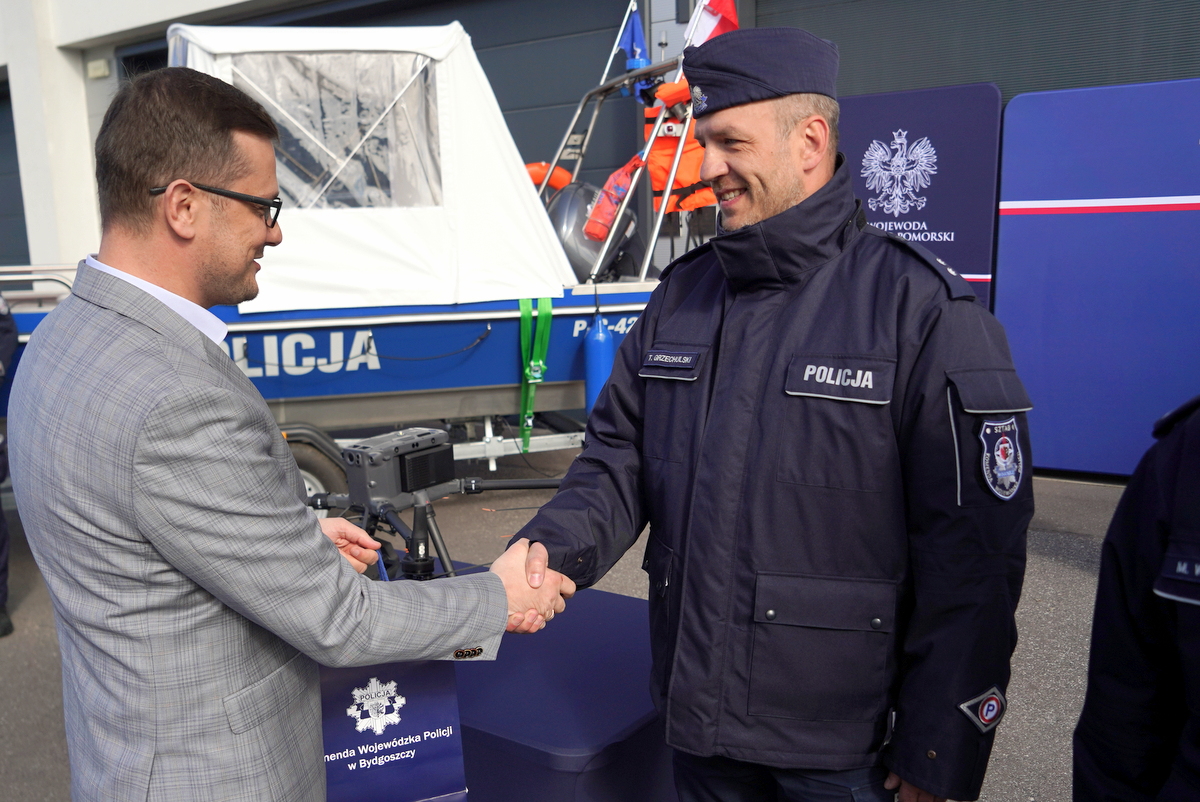 Kujawsko-pomorska Policja wzbogaciła się o nowoczesny sprzęt operacyjny - dwie łodzie motorowe oraz bezzałogowy statek powietrzny o łącznej wartości blisko 500 tys. zł. Zakup sprzętów zrealizowany został w ramach Programu Ochrony Ludności i Obrony Cywilnej na lata 2025-2026. Uroczystego przekazania dokonał Wojewoda Kujawsko-Pomorski Michał Sztybel w obecności kierownictwa Komendy Wojewódzkiej Policji w Bydgoszczy.