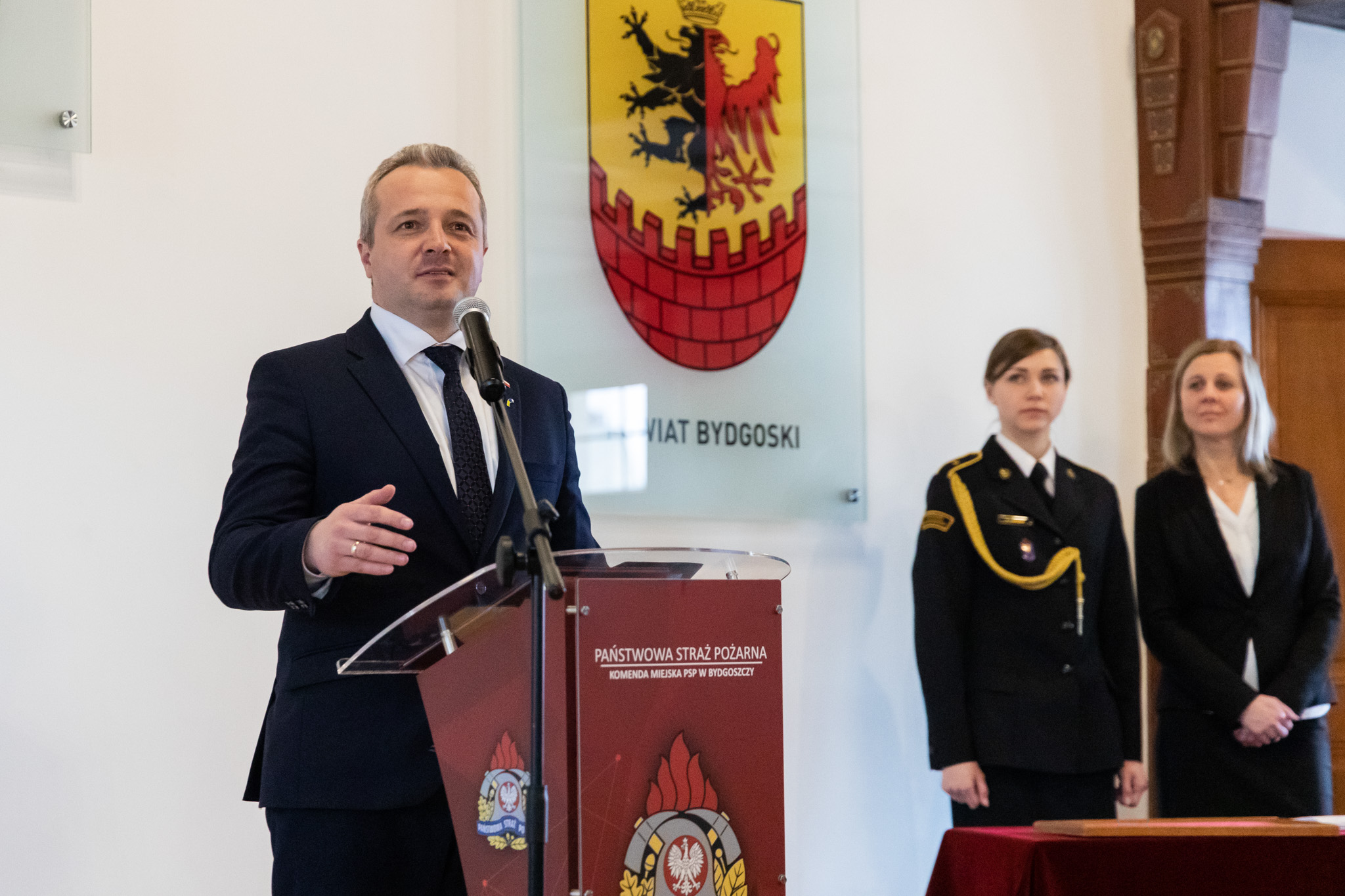 Wojewoda Mikołaj Bogdanowicz pogratulował nowemu szefowi bydgoskich strażaków. Przypomniał też jak ważną rolę odgrywali strażacy m.in. w czasie pięciu kolejnych fal pandemii oraz od początku napaści Rosji na Ukrainę.