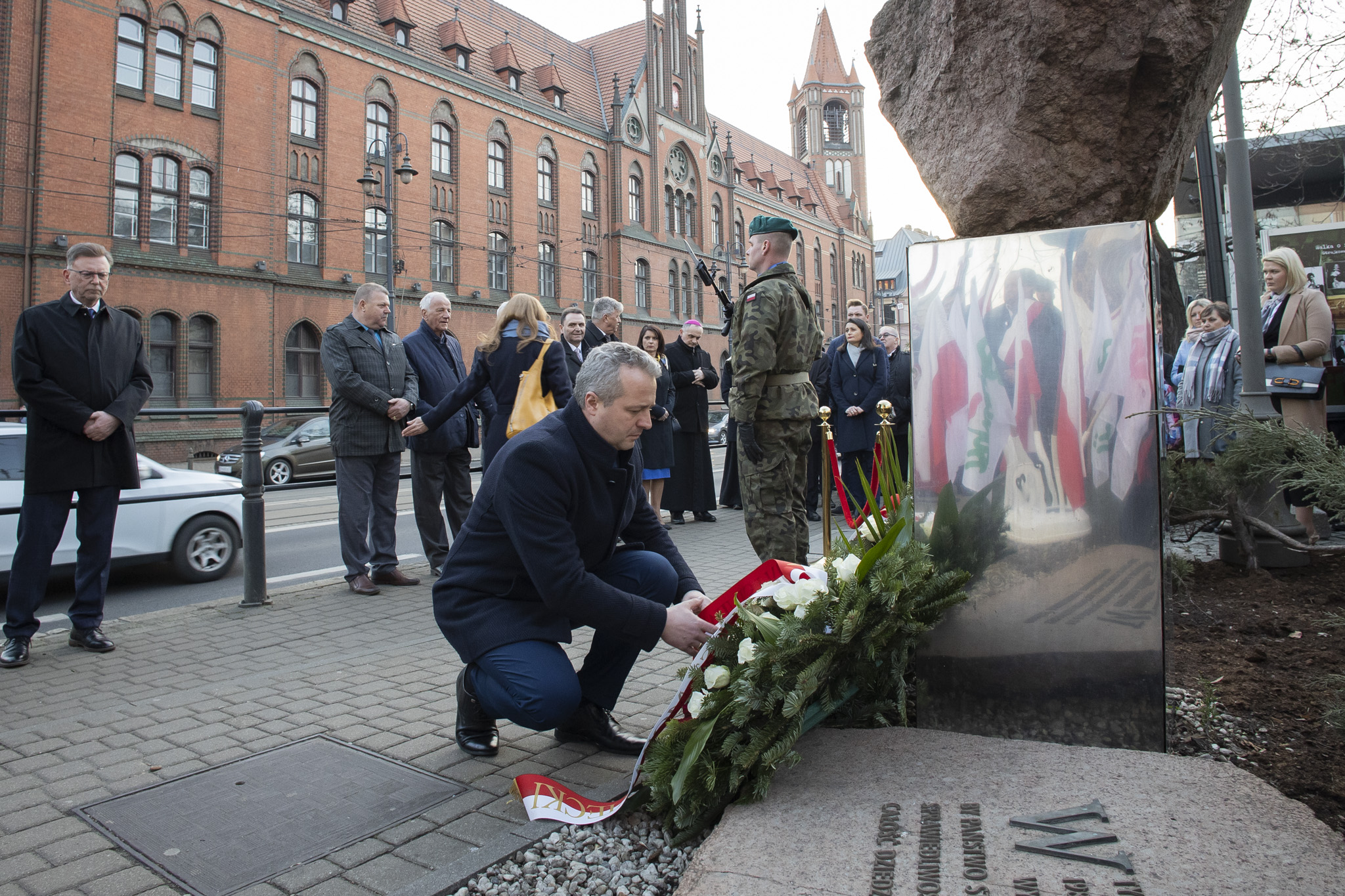 Po mszy św. obchody przeniosły się przed budynek Kujawsko-Pomorskiego Urzędu Wojewódzkiego przy ul. Jagiellońskiej 3, gdzie zostały złożone kwiaty pod tablicą upamiętniającą wydarzenia Bydgoskiego Marca 1981. Uroczystość rozpoczęła się od Hymnu Polski w wykonaniu bydgoskiej orkiestry wojskowej.