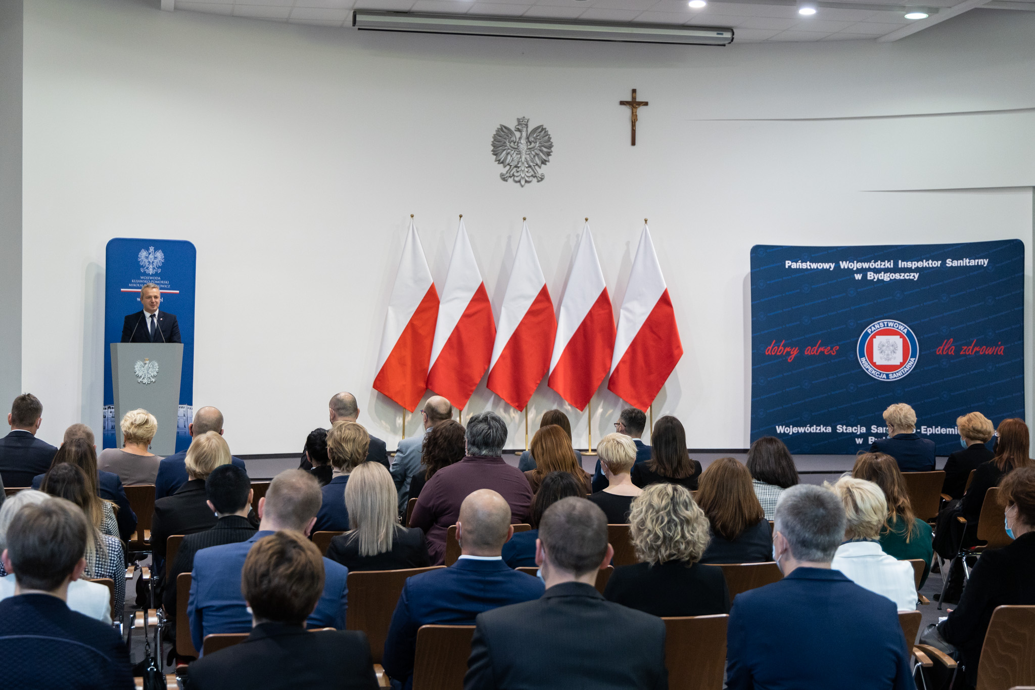 Minister dziękował również wojewodzie za codzienne wsparcie Inspekcji Sanitarnej. Wspomniał też o 18 pracownikach, którzy mimo trudnej sytuacji w województwie kujawsko-pomorskim zdecydowali się pojechać do województwa śląskiego i wesprzeć tamtejszych pracowników Inspekcji Sanitarnej w bardzo trudnym dla nich okresie skokowego przyrostu zakażeń. Dziś otrzymali oni Krzyże Zasługi nadane przez Prezydenta RP.