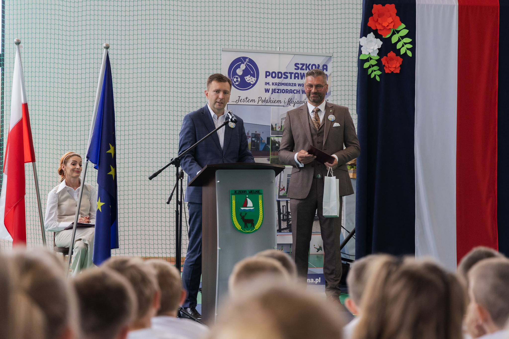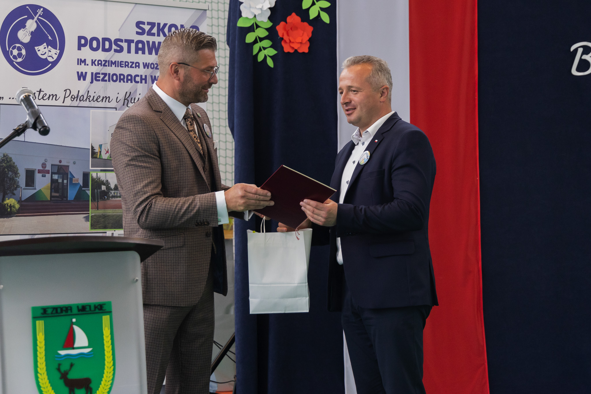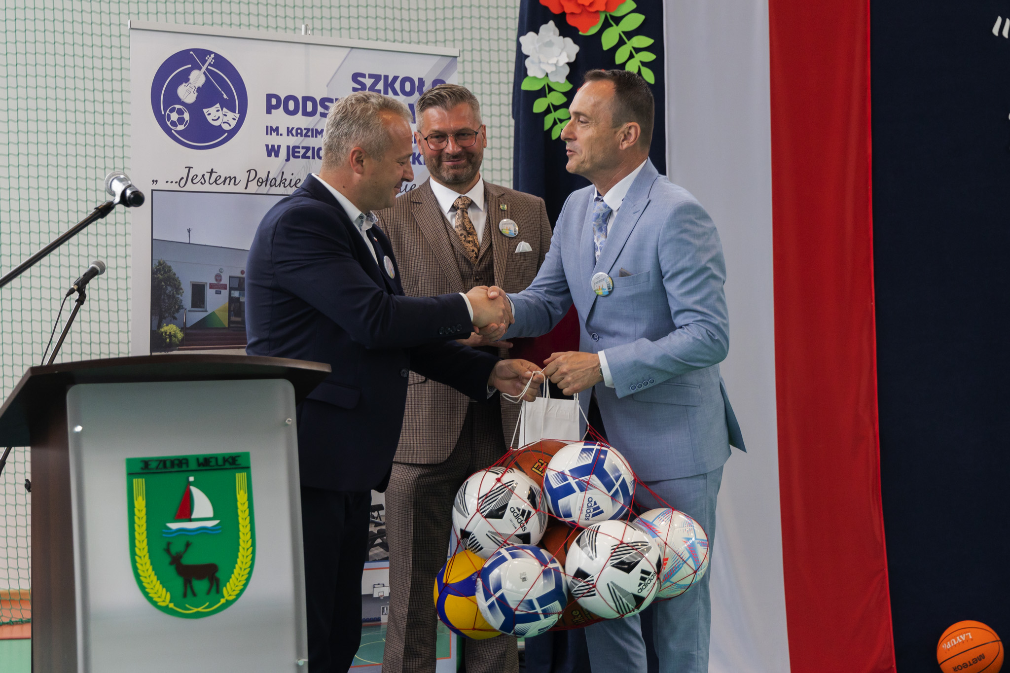 Wojewoda Mikołaj Bogdanowicz, gratulując zakończenia inwestycji podkreślił, że imponująca hala sportowa nie powstałaby, gdyby nie pomoc i wsparcie ministra Łukasza Schreibera i poseł Ewy Kozaneckiej oraz gdyby nie determinacja Wójta Gminy Jeziora Wielkie Dariusza Ciesielczyka.