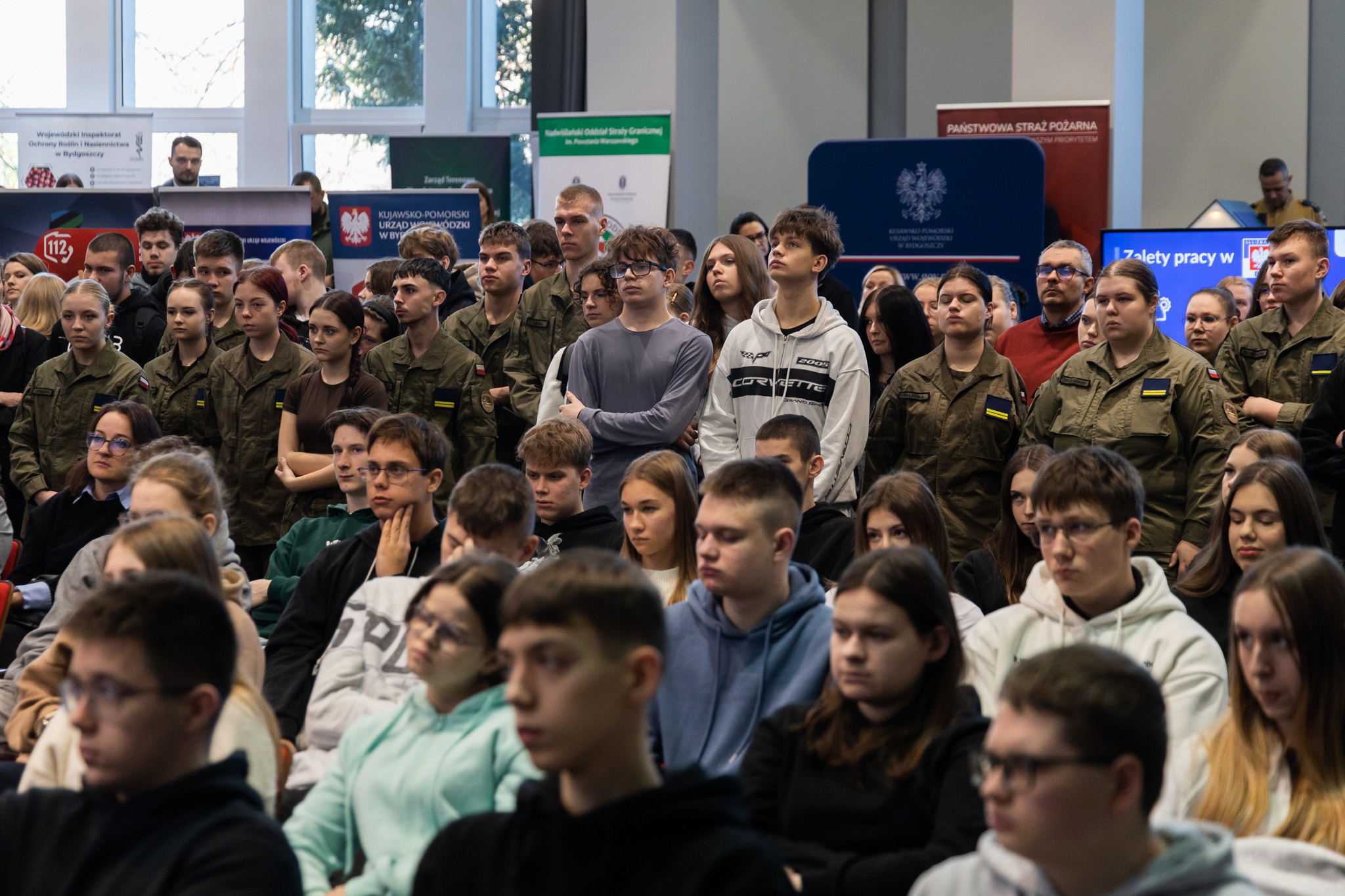 Podczas Targów Pracy „Pracuj dla Polski” Kujawsko-Pomorski Urząd Wojewódzki wypełnił się osobami zainteresowanymi karierą w sektorze publicznym, studentami, uczniami oraz osobami, które chciały dowiedzieć się więcej o pracy w służbie cywilnej. Miały one okazję odwiedzić stanowiska licznie zgromadzonych służb, inspekcji i instytucji współpracujących z Wojewodą - Policji, Państwowej Straży Pożarnej, Wojsk Obrony Terytorialnej, Straży Granicznej, Krajowej Administracji Skarbowej, Wojewódzkiej Stacji Sanitarno-Epidemiologicznej czy Wojewódzkiego Inspektoratu Weterynarii. Nie zabrakło również stoisk poszczególnych wydziałów Kujawsko-Pomorskiego Urzędu Wojewódzkiego oraz stanowiska Dyspozytorni Medycznej i Centrum Powiadamiania Ratunkowego 112.