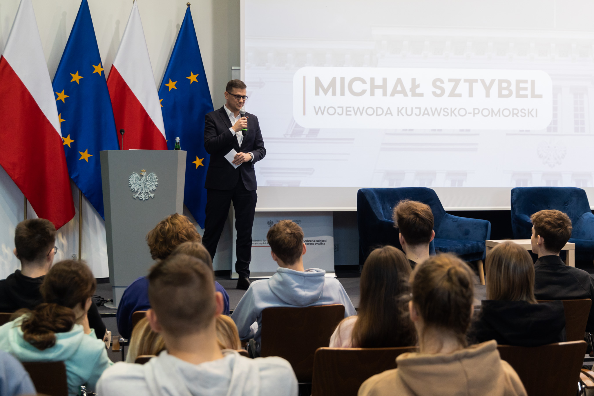 - mówił Wojewoda rozpoczynając lekcję obywatelską, podczas której poruszone zostały najbardziej aktualne tematy związane z ochroną ludności i obroną cywilną, wśród których znalazły się zagadnienia takie jak m.in. współczesny patriotyzm, cyberbezpieczeństwo, dezinformacja oraz właściwe zachowania w sytuacjach kryzysowych. Uczestnicy również dowiedzieli się, jak funkcjonuje urząd wojewódzki, jakie zadania realizuje Wojewoda oraz w jaki sposób współpracuje on ze służbami i instytucjami publicznymi.