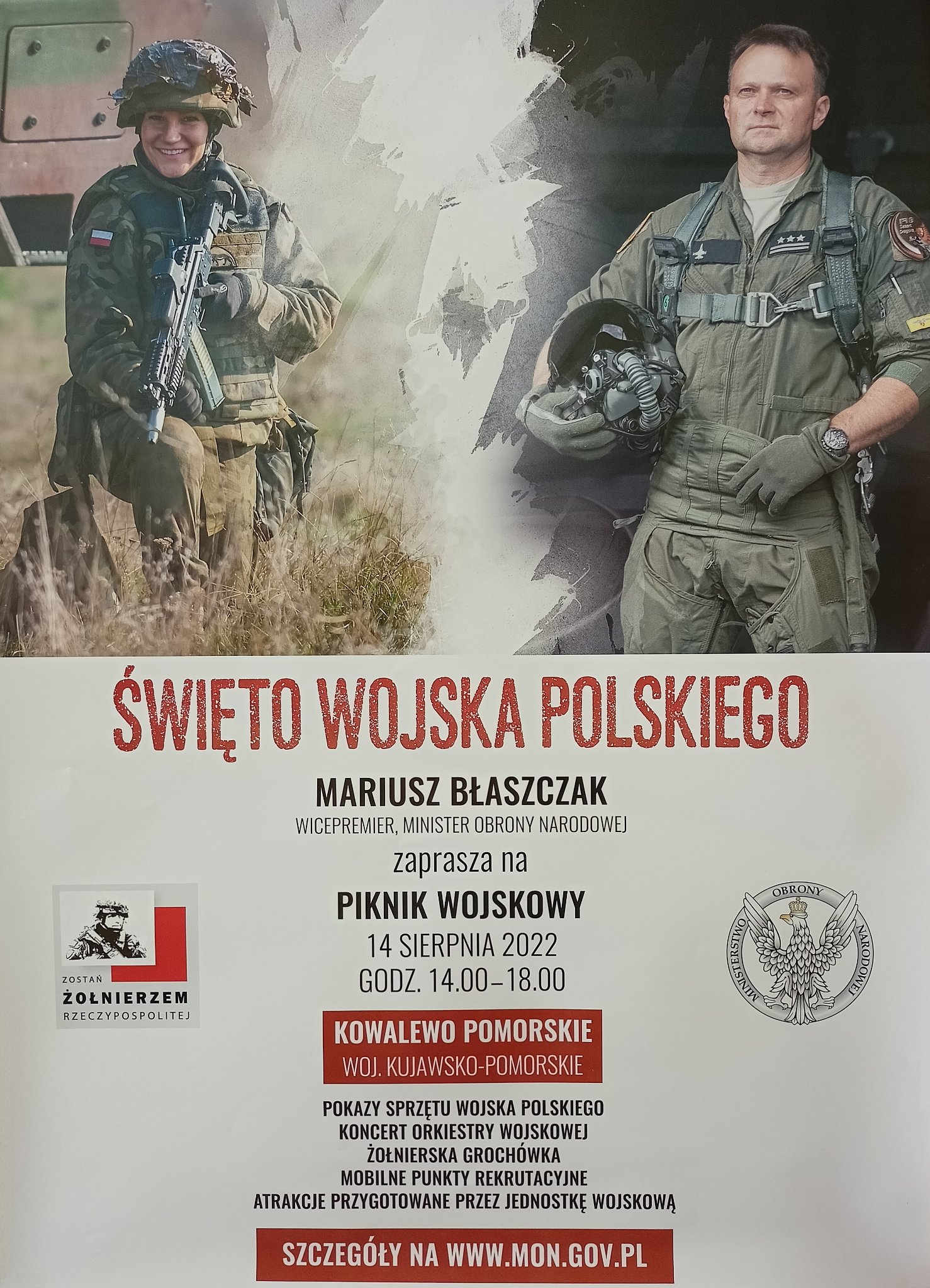 Na terenie województwa kujawsko-pomorskiego odbędą się 3 pikniki wojskowe: w dniu 13.08 w Radziejowie („Miasteczko Drogowe” przy ul. Sportowej), w dniu 14.08 w Kowalewie Pomorskim (Centrum Rekreacji i Sportu przy ul. Chopina 26) oraz w dniu 15.08 w Więcborku (Plac Jana Pawła II). Każdy z pikników odbędzie się w godzinach od 14.00 do 18.00. Dodatkowo w Więcborku przy Przystani Rybackiej (ul. Potulickich 4) o godz. 16.00 zapraszamy wszystkich miłośników kina wojennego na projekcję filmu „Powstanie Warszawskie” w ramach kina frontowego. Wstęp wolny.