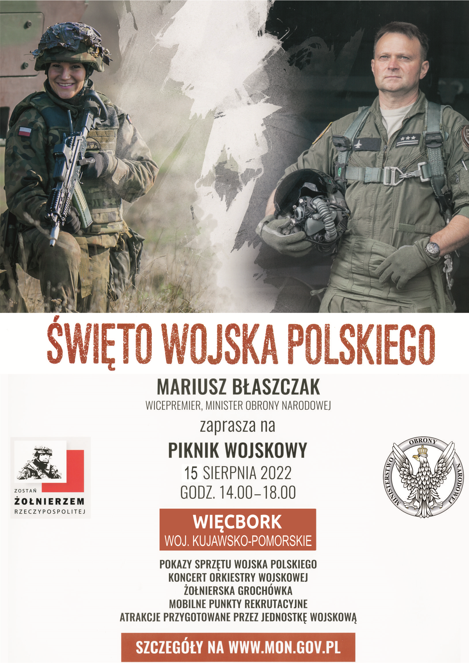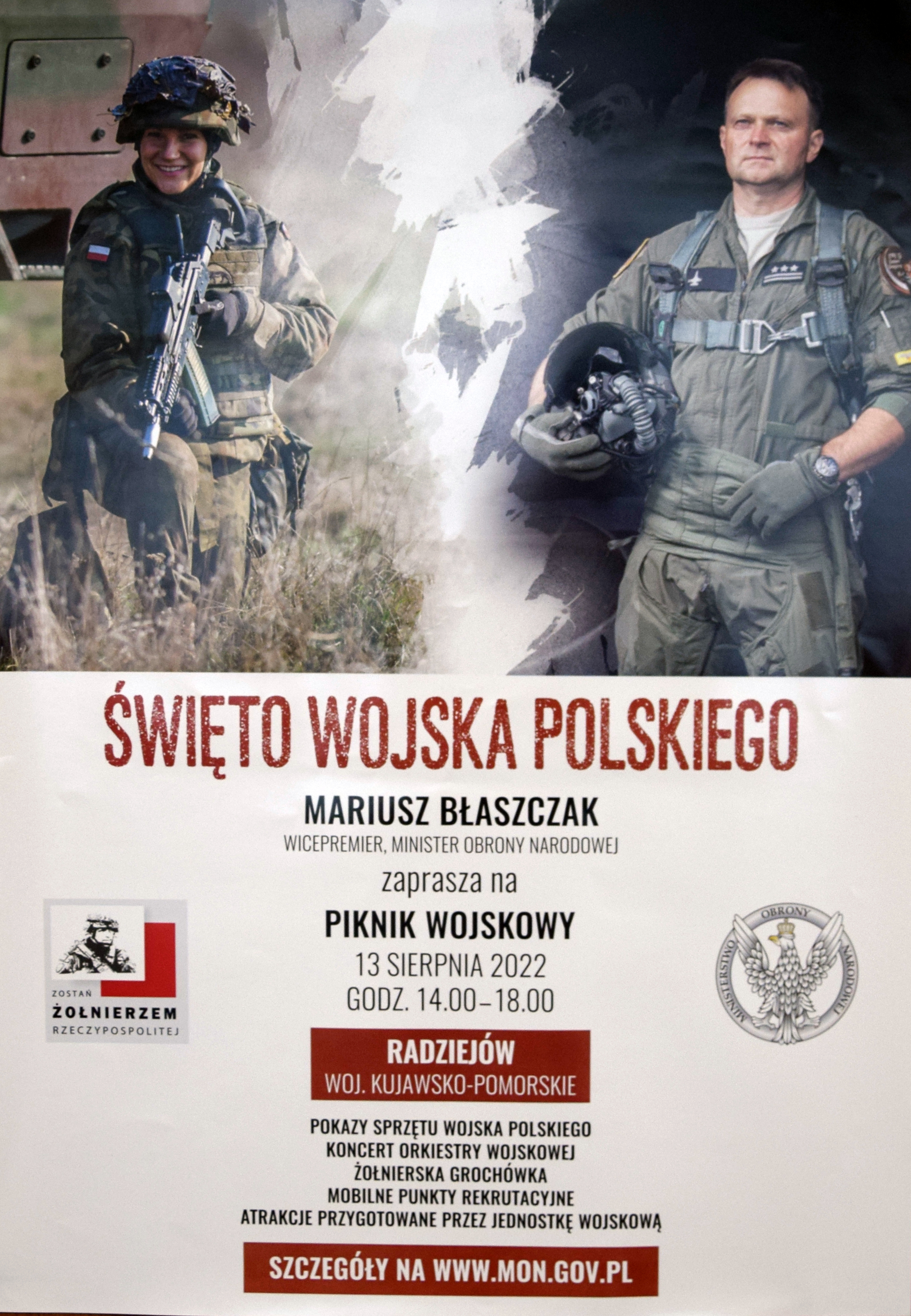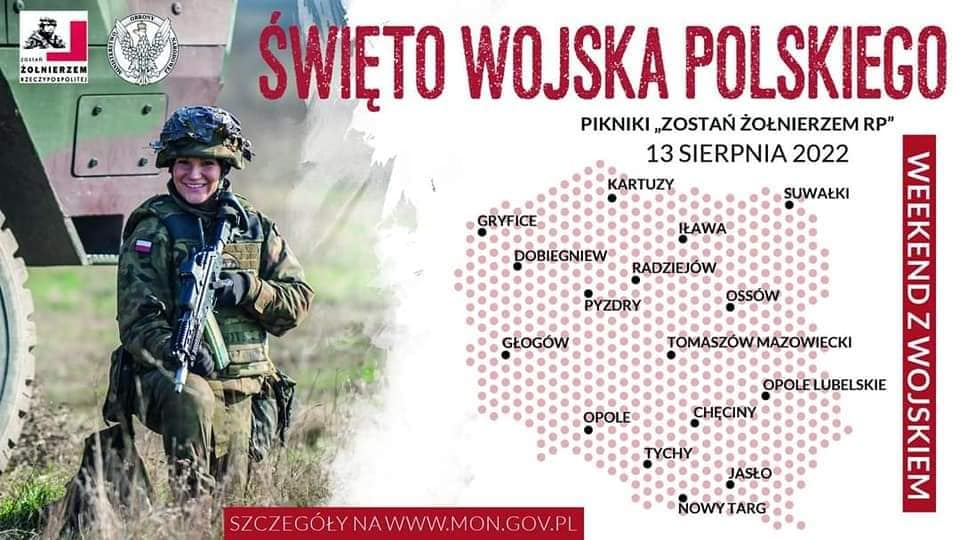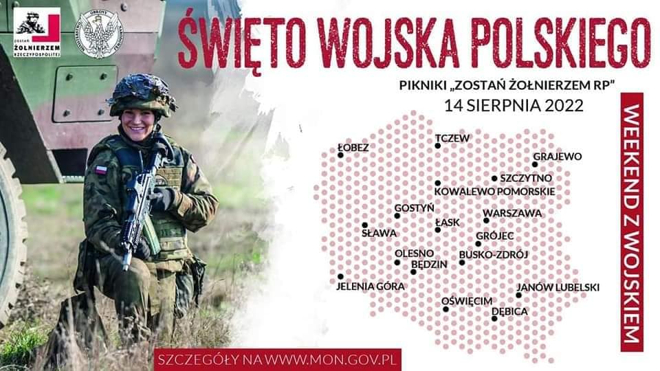 „Zostań Żołnierzem. Dobrowolna Zasadnicza Służba Wojskowa” - pod takim hasłem w dniach 13-15.08.2022 r. w całym kraju w ramach obchodów Święta Wojska Polskiego oraz 102. rocznicy Bitwy Warszawskiej zorganizowane zostanie kilkadziesiąt pikników wojskowych.
