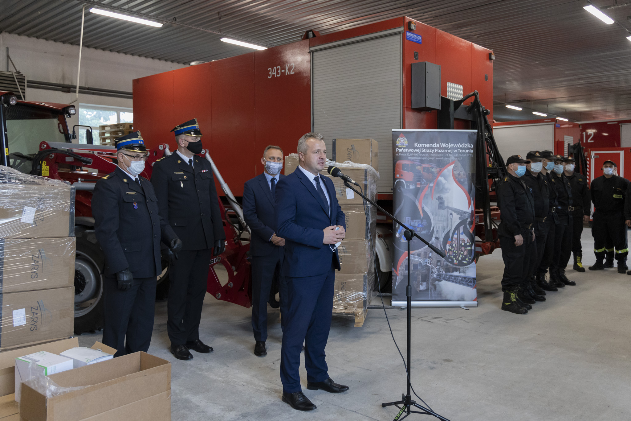 Dzisiaj, na terenie Jednostki Ratowniczo-Gaśniczej Nr 3 w Toruniu odbyła się konferencja prasowa z udziałem Wojewody Kujawsko-Pomorskiego Mikołaja Bogdanowicza oraz Komendanta Wojewódzkiego PSP w Toruniu bryg. Jacka Kaczmarka i Ireneusza Stachowiaka, Prezesa Wojewódzkiego Funduszu Ochrony Środowiska i Gospodarki Wodnej w Toruniu. Głównymi tematami konferencji były: program finansowania służb ratowniczych oraz podsumowanie dotychczasowych działań Państwowej Straży Pożarnej w związku z epidemią koronawirusa 2019-nCoV na terenie województwa.