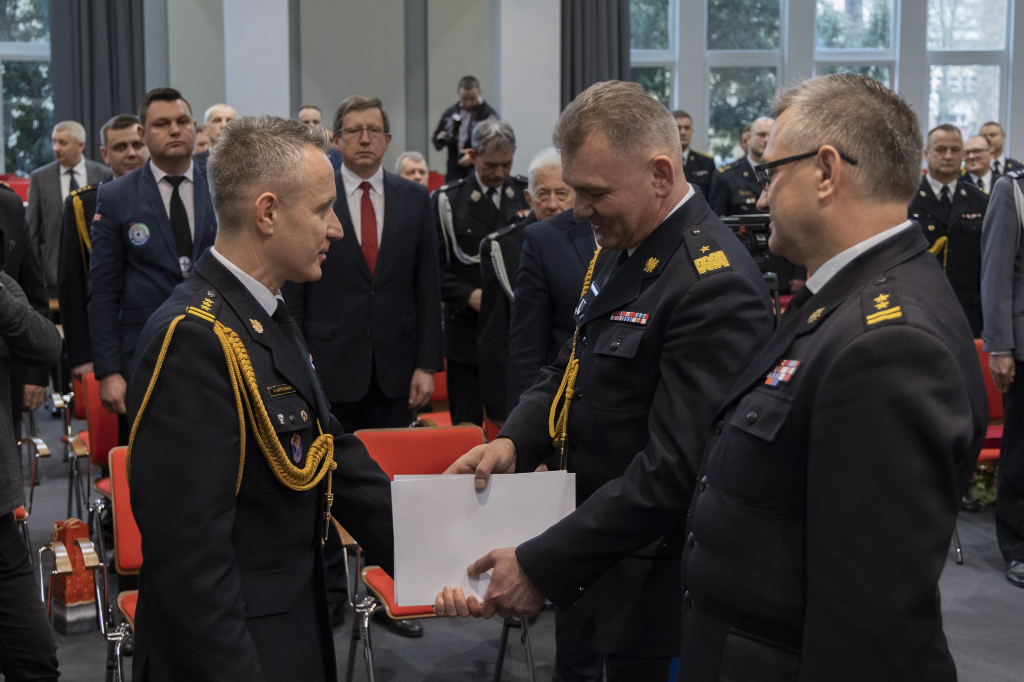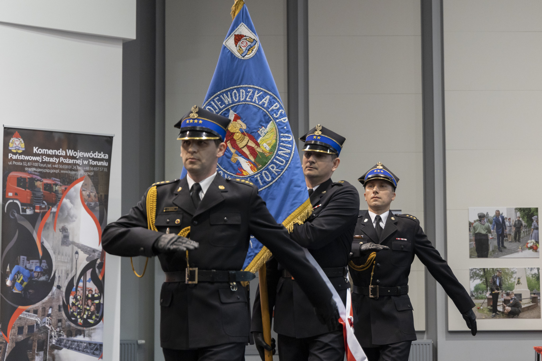 Na zakończenie swojego wystąpienia ustępujący komendant zaprosił na scenę Komendanta Głównego Państwowej Straży Pożarnej st. bryg. Andrzeja Bartkowiaka oraz Wojewodę Kujawsko-Pomorskiego Mikołaja Bogdanowicza, dla których przygotował okolicznościowe medale w podziękowaniu za wspólną służbę.