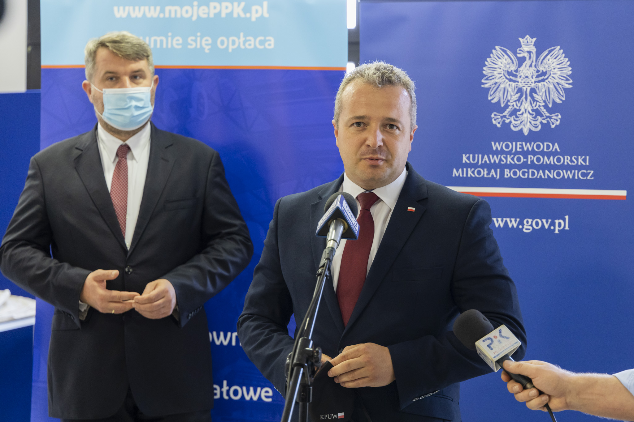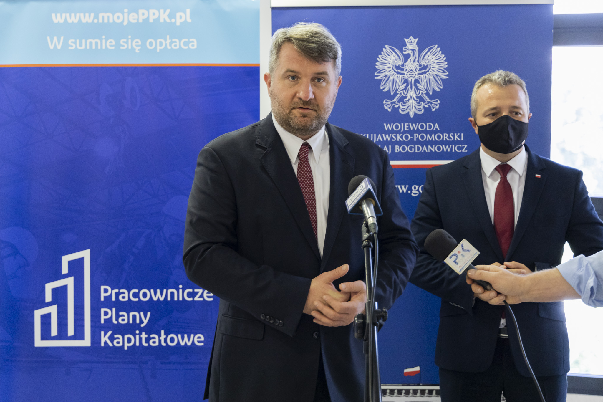 Tuż przed konferencją, na krótkim briefingu prasowym z dziennikarzami spotkali się Wojewoda Kujawsko-Pomorski Mikołaj Bogdanowicz oraz Prezes PFR Portal PPK Robert Zapotoczny.