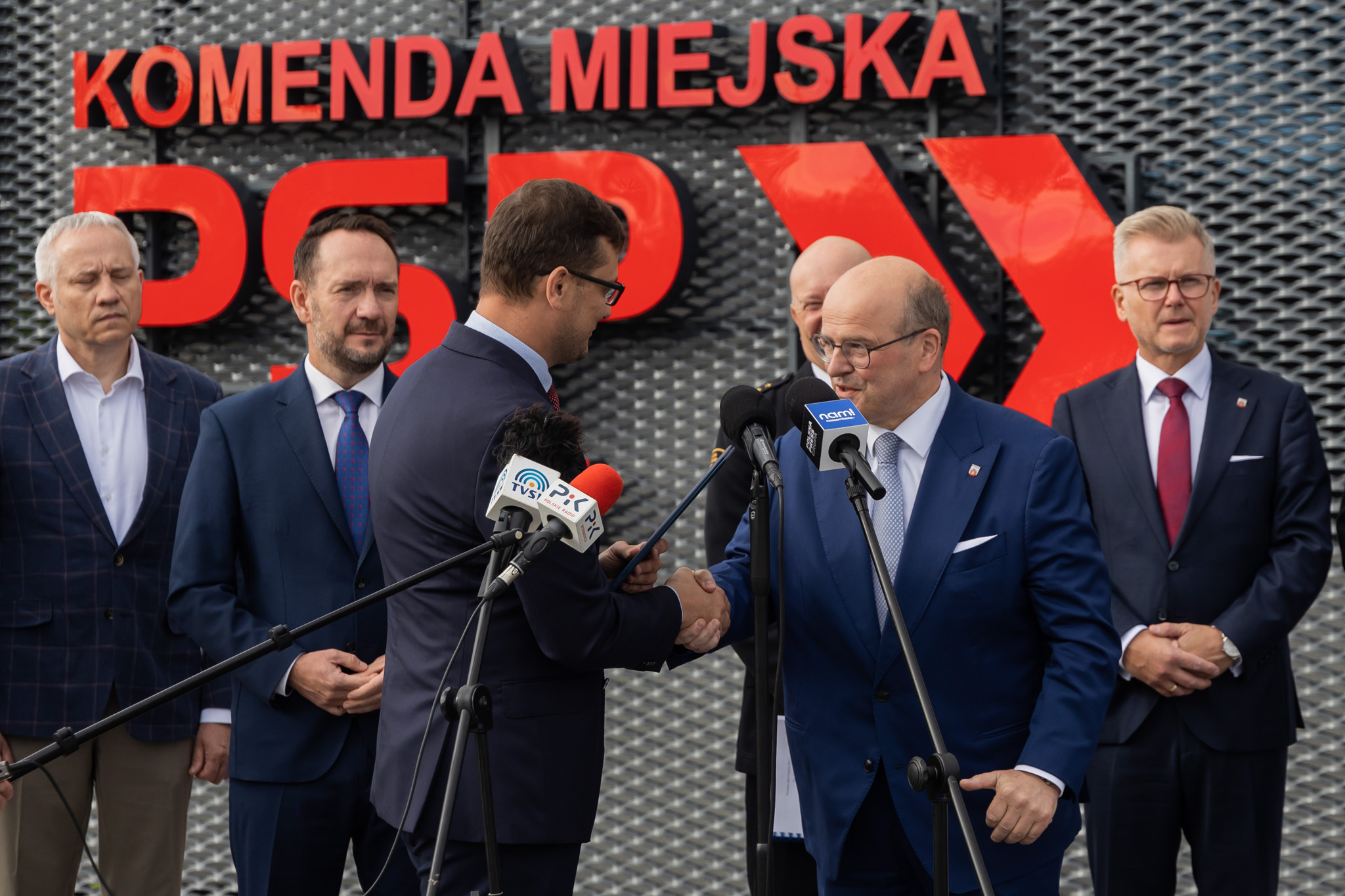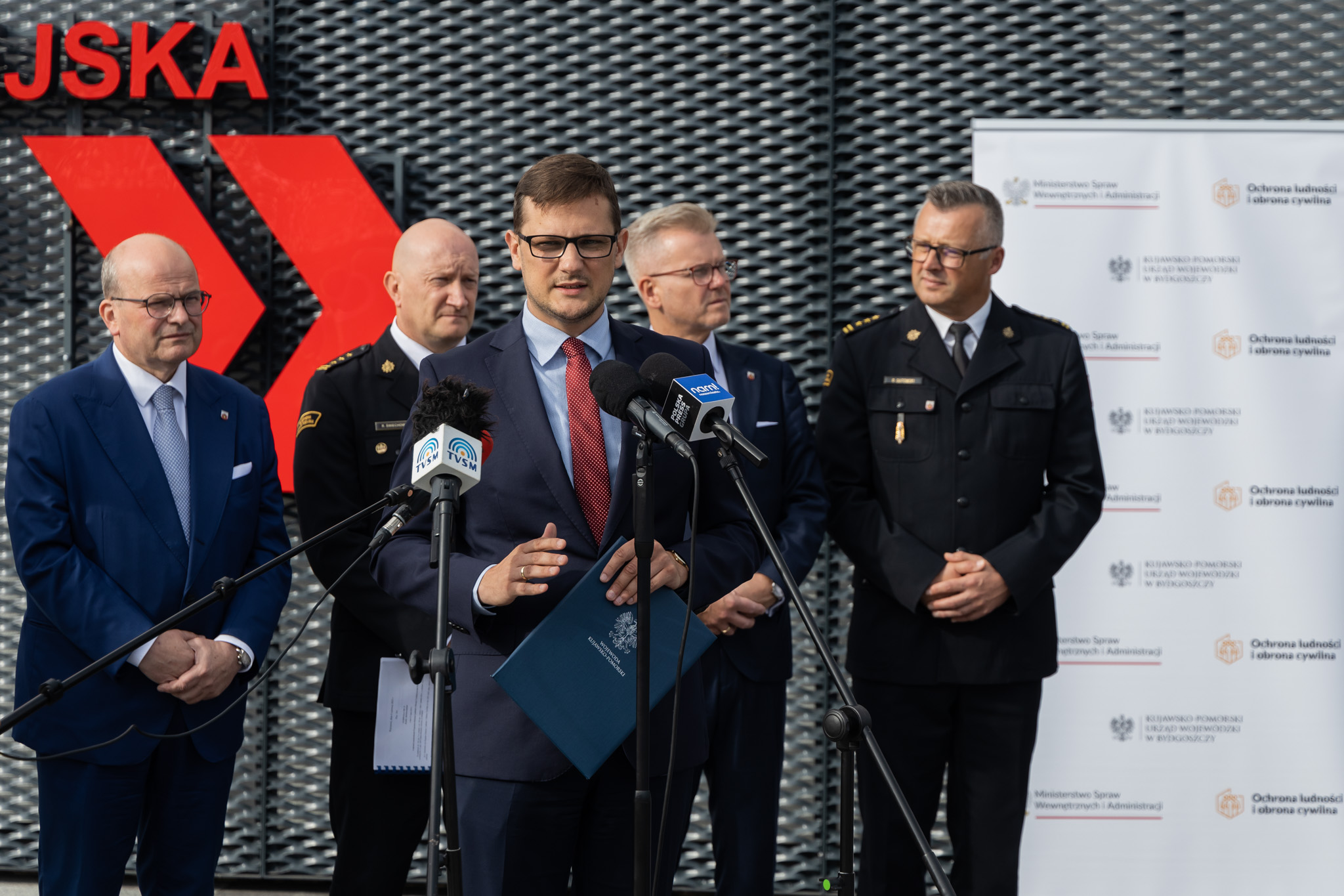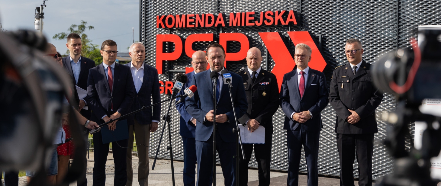 W nowej strażnicy PSP w Grudziądzu odbyła się konferencja prasowa Ministra Tomasza Szymańskiego, Sekretarza Stanu w Ministerstwie Spraw Wewnętrznych i Administracji oraz Wojewody Kujawsko-Pomorskiego Michała Sztybla. Podczas konferencji Wojewoda przekazał pierwszą, symboliczną umowę dla miasta Grudziądza na realizację zadań z zakresu ustawy o ochronie ludności i obronie cywilnej.