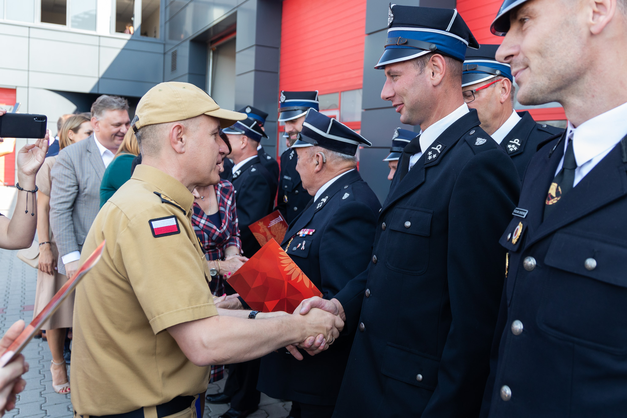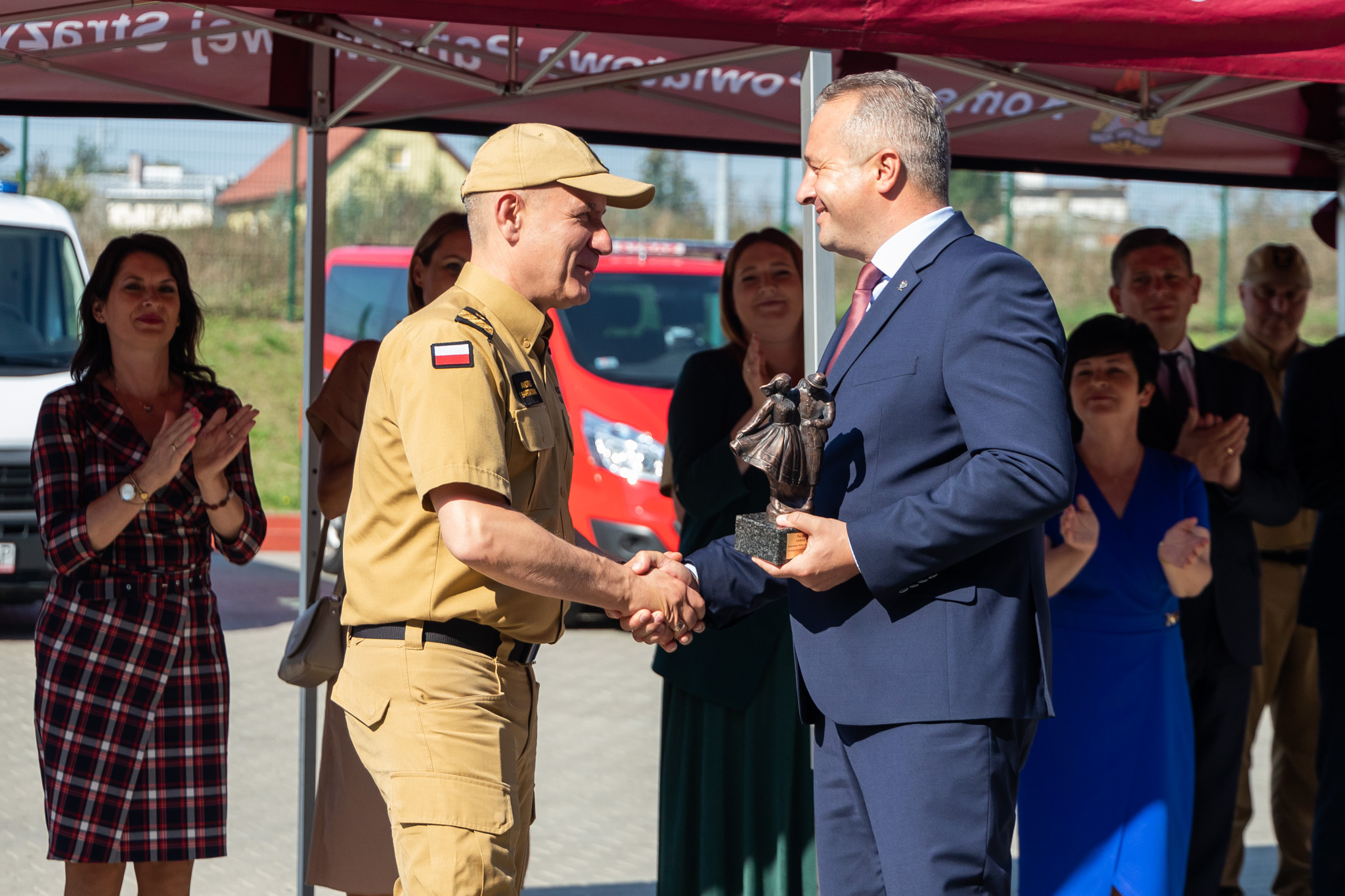 Korzystając z okazji wojewoda wręczył pamiątkową statuetkę i podziękował za wsparcie jednostek OSP i PSP w naszym regionie Komendantowi Głównemu Państwowej Straży Pożarnej gen. bryg. Andrzejowi Bartkowiakowi.