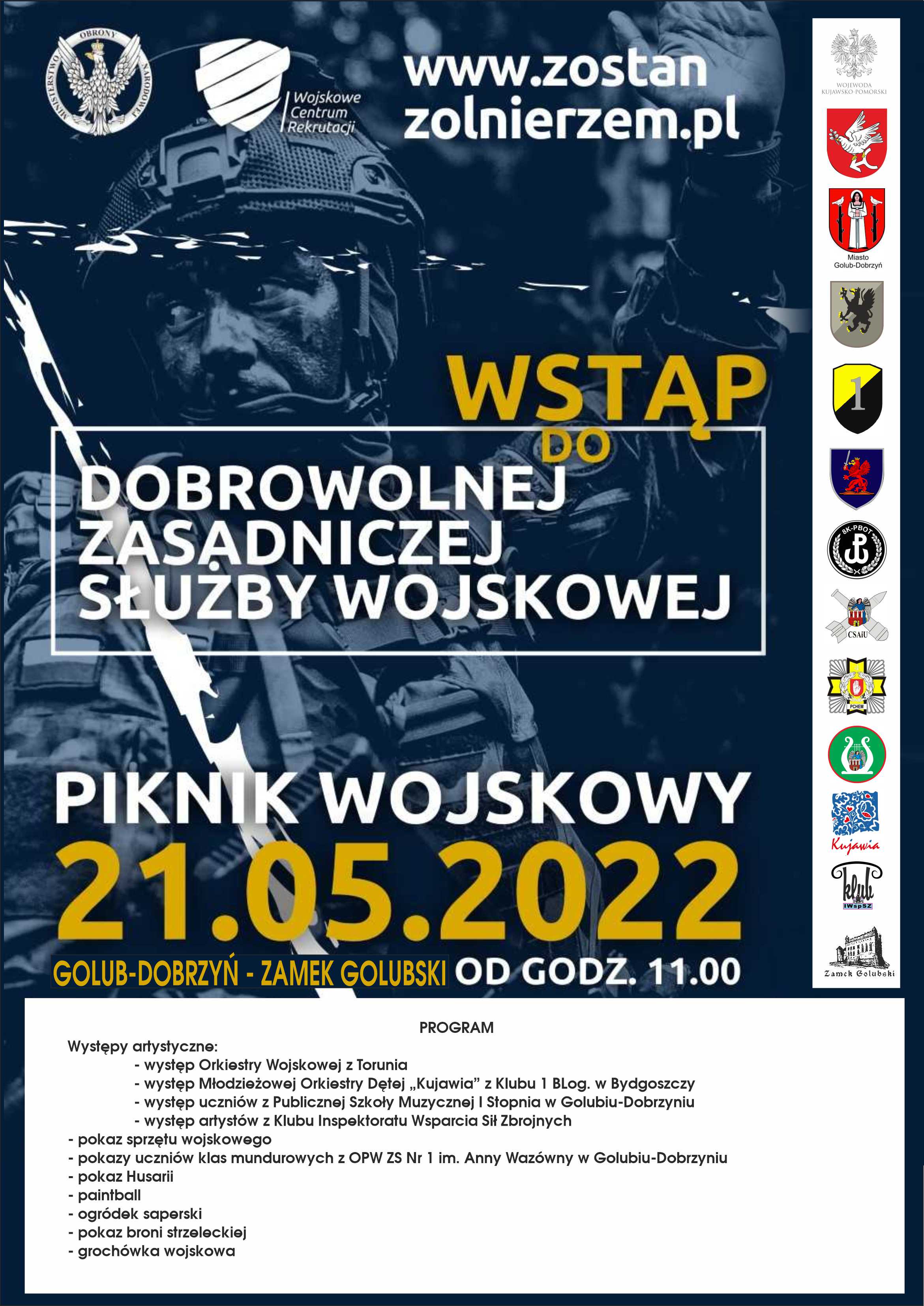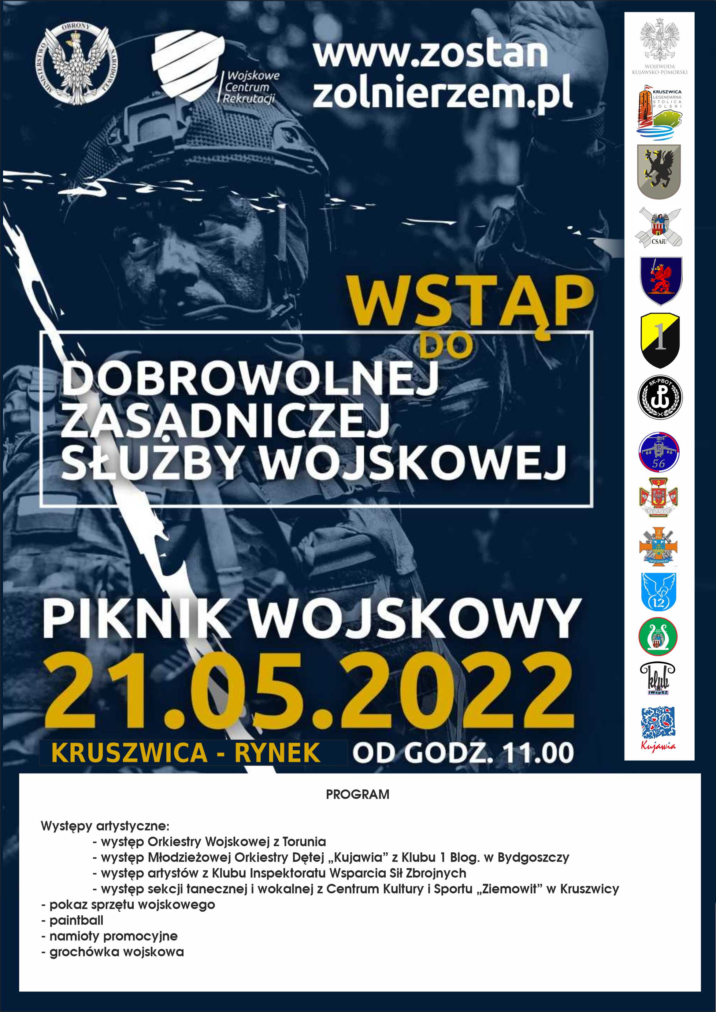 W najbliższą sobotę, tj. 21 maja rozpocznie się nabór do nowego rodzaju służby w wojsku – dobrowolnej zasadniczej służby wojskowej. Z tej okazji, w 32 miejscowościach w całej Polsce, odbędą się pikniki wojskowe pod hasłem „Wstąp do dobrowolnej zasadniczej służby wojskowej”. W Kujawsko-Pomorskiem pikniki zaplanowano w Kruszwicy i Golubiu-Dobrzyniu, gdzie od godz. 11.00 będą działały punkty rekrutacyjne, ale także będzie można m.in. obejrzeć nowoczesny sprzęt wojskowy.