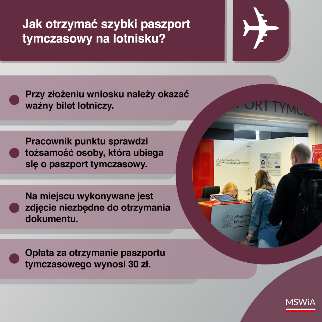 Przed zaplanowaną podróżą zachęcamy do zapoznania się z godzinami otwarcia punktów na poszczególnych lotniskach: https://www.gov.pl/web/mswia/uzyskaj-paszport-tymczasowy-w-punkcie-na-lotnisku