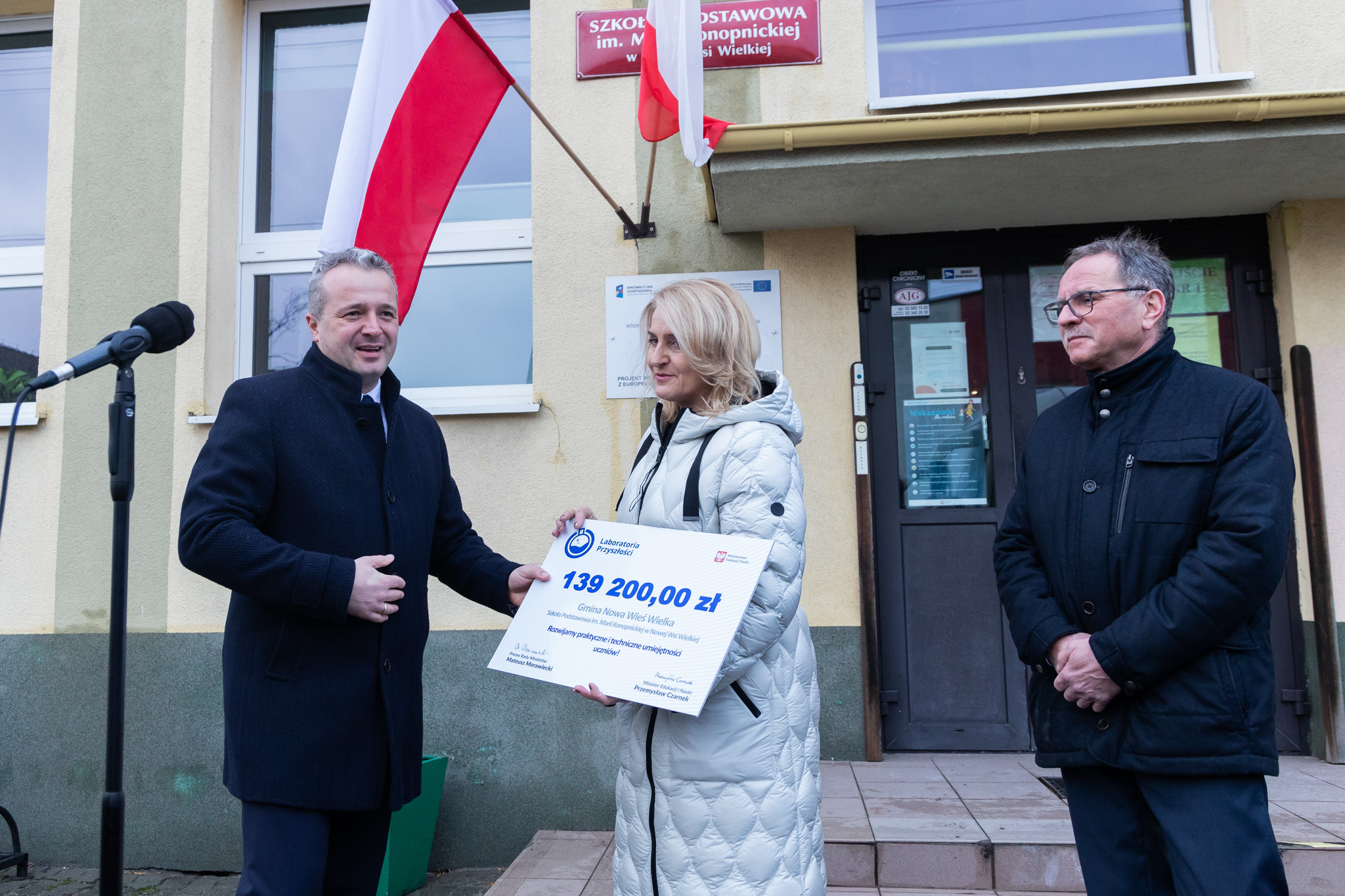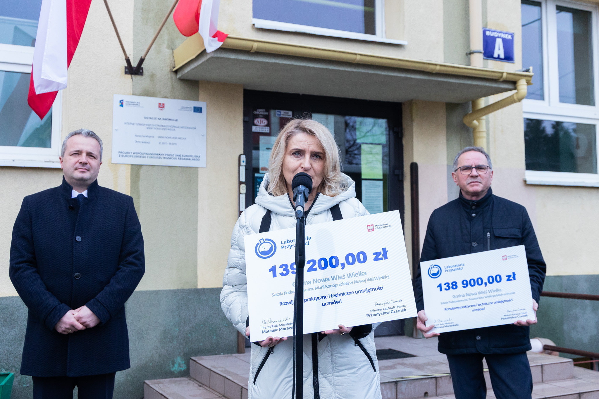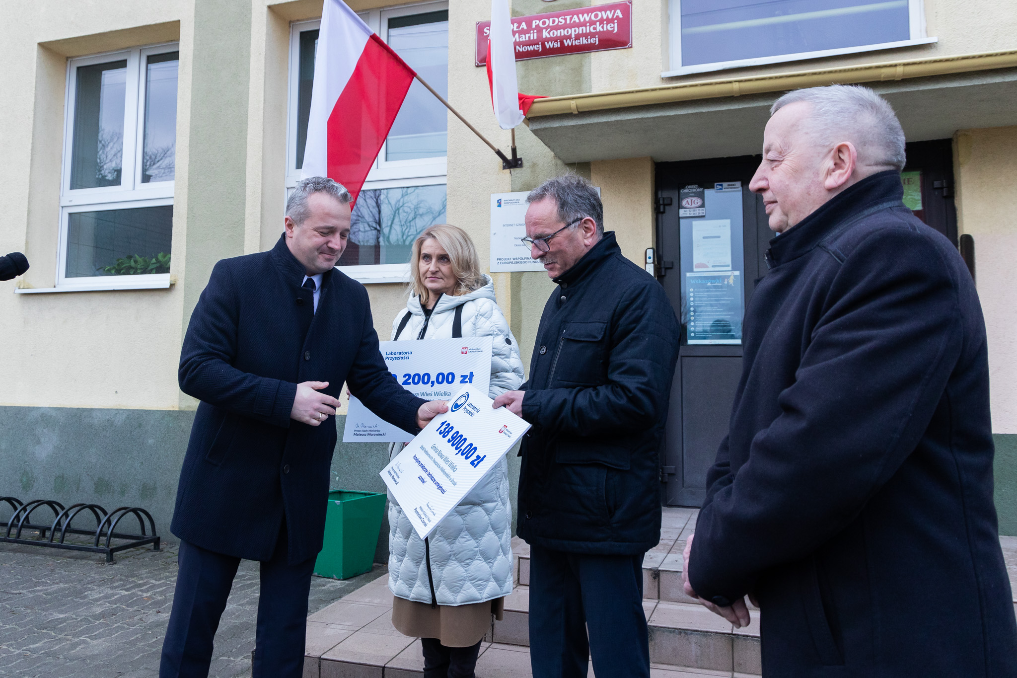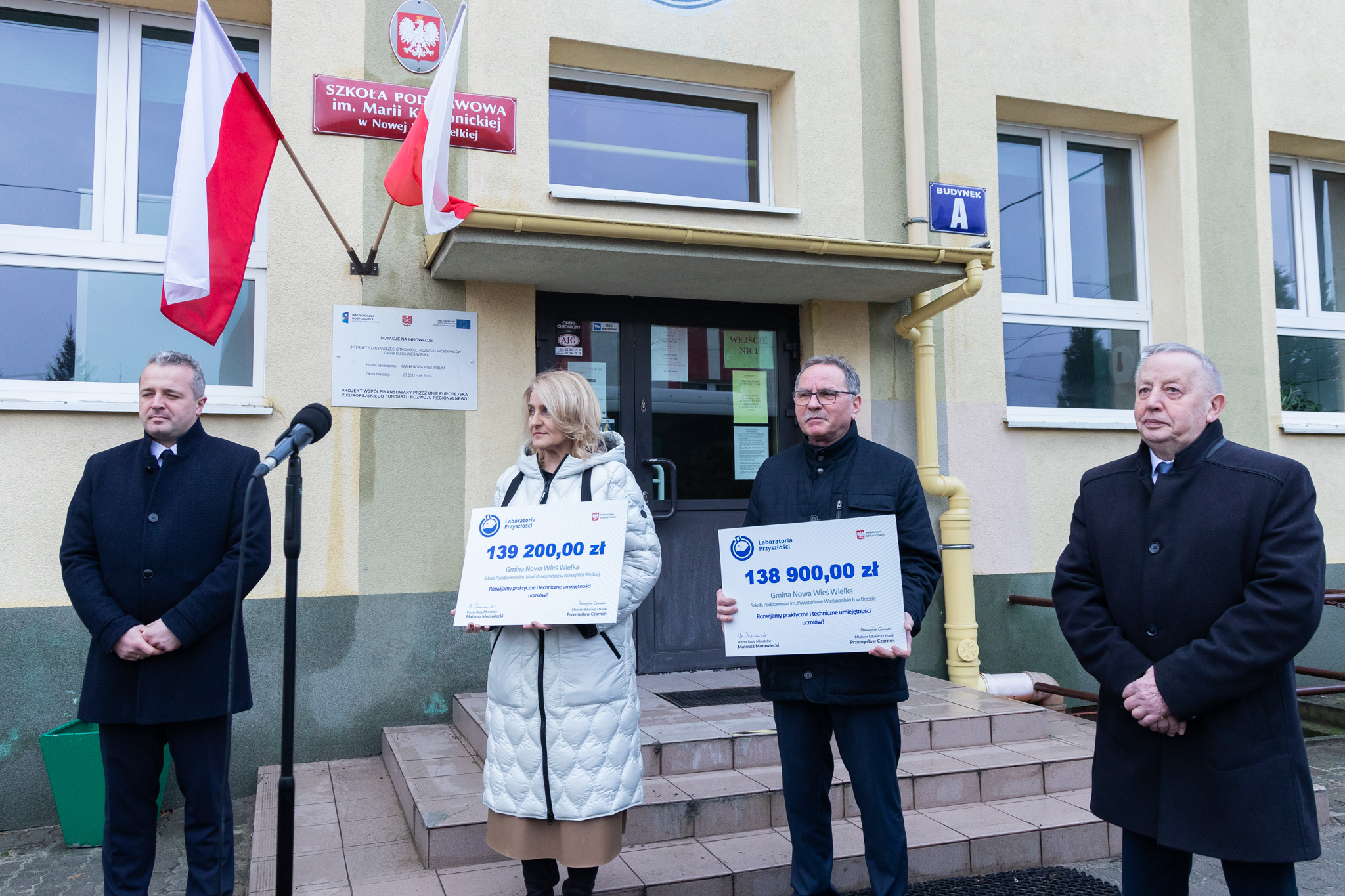 Wojewoda przekazał na ręce dyrektora Szkoły Podstawowej im. Marii Konopnickiej w Nowej Wsi Wielkiej Justynie Łukaszewicz symboliczny czek na kwotę 139 200,00 zł. Dyrektor Szkoły Podstawowej im. Powstańców Wielkopolskich w Brzozie Aleksander Królikowski otrzymał z rąk wojewody czek na kwotę 138 900,00 zł.