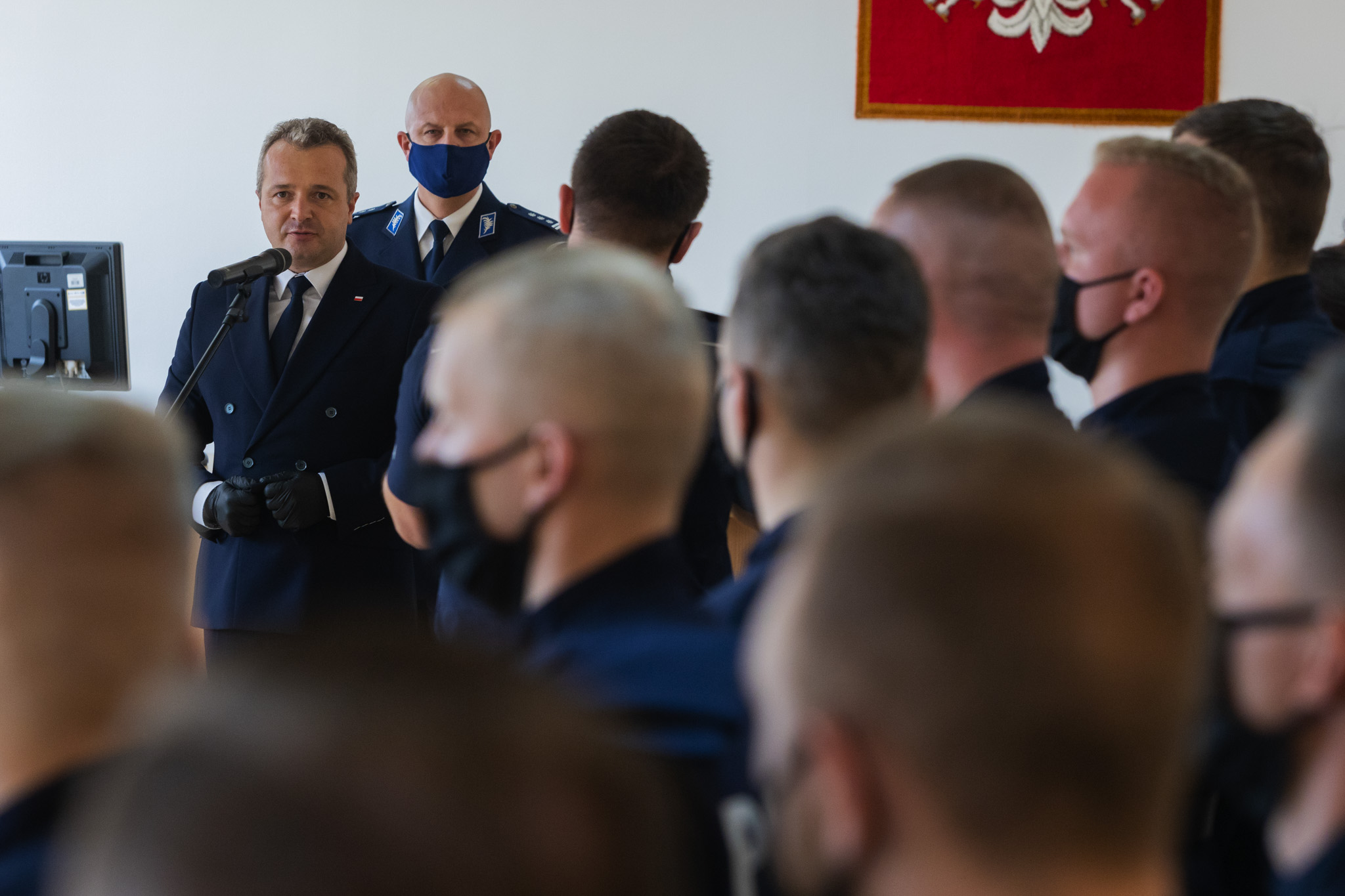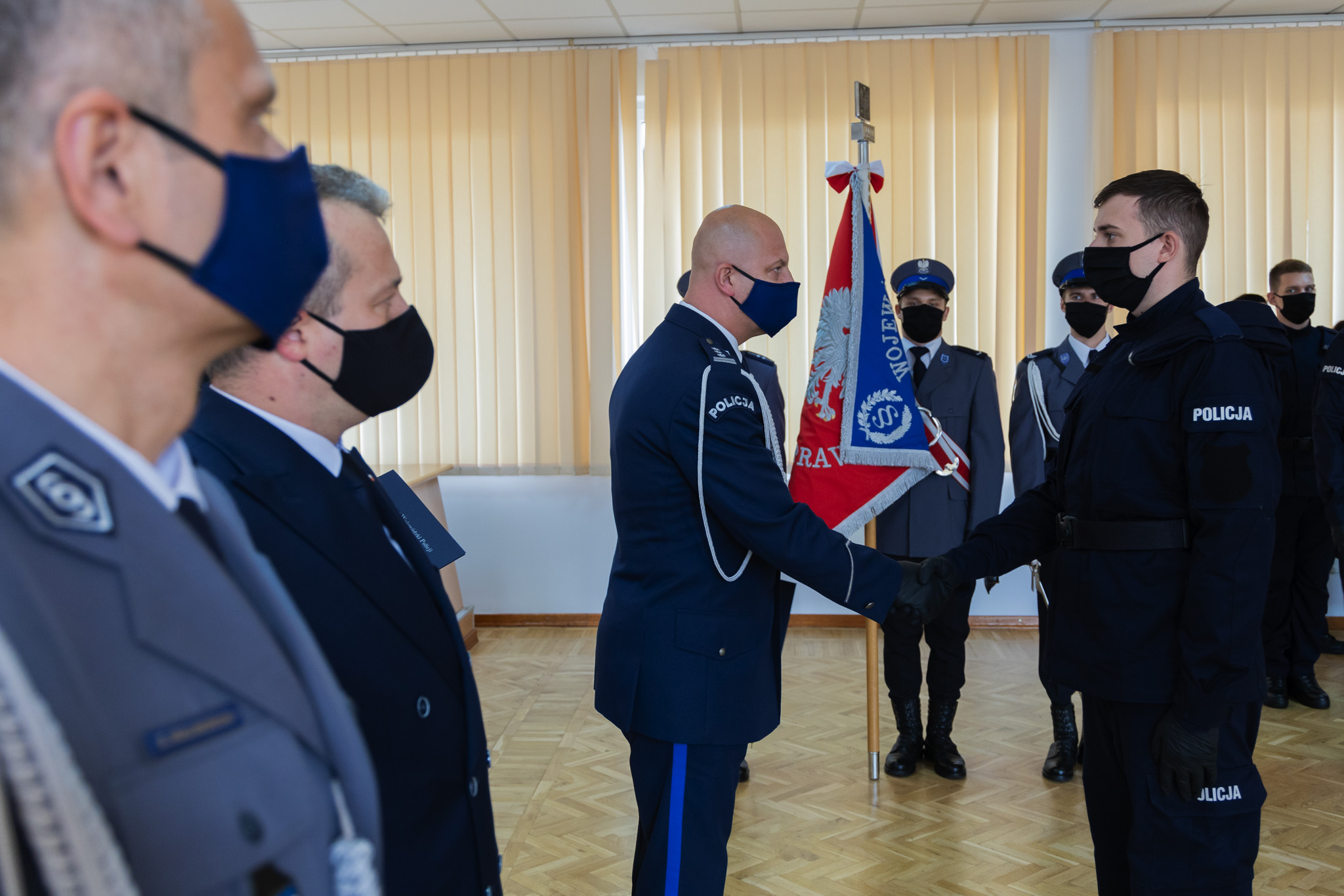 - Dzisiejsza uroczystość ślubowania jest bardzo skromna, ale wymagają tego czasy, w których żyjemy. Złożyć akt ślubowania w obecności Wojewody, w obecności sztandaru i w obecności przełożonych, to ważny dzień w życiu każdego policjanta. Wypowiedziane dzisiaj słowa mają wielką wagę. - Tymi słowami zwrócił się insp. Piotr Leciejewski do policjantów składających ślubowanie.
