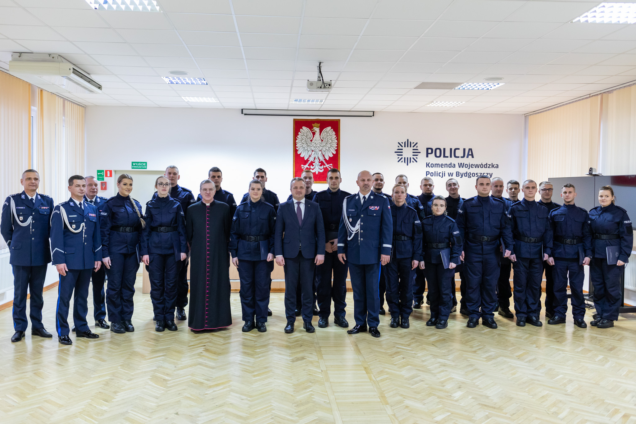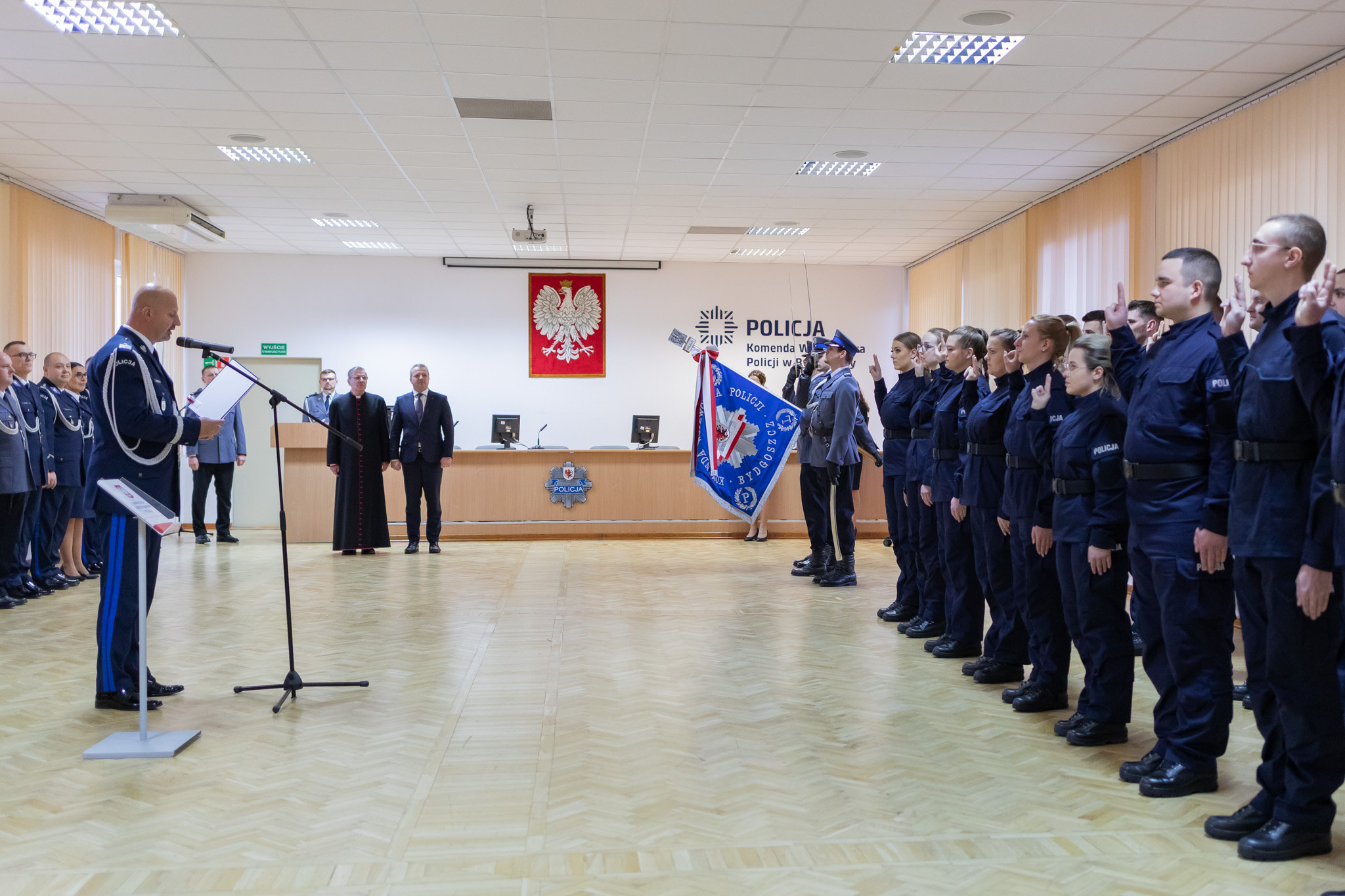 W Komendzie Wojewódzkiej Policji w Bydgoszczy odbyło się dzisiaj ślubowanie nowo przyjętych funkcjonariuszy. W uroczystości uczestniczył m.in. Wojewoda Kujawsko-Pomorski Mikołaj Bogdanowicz.