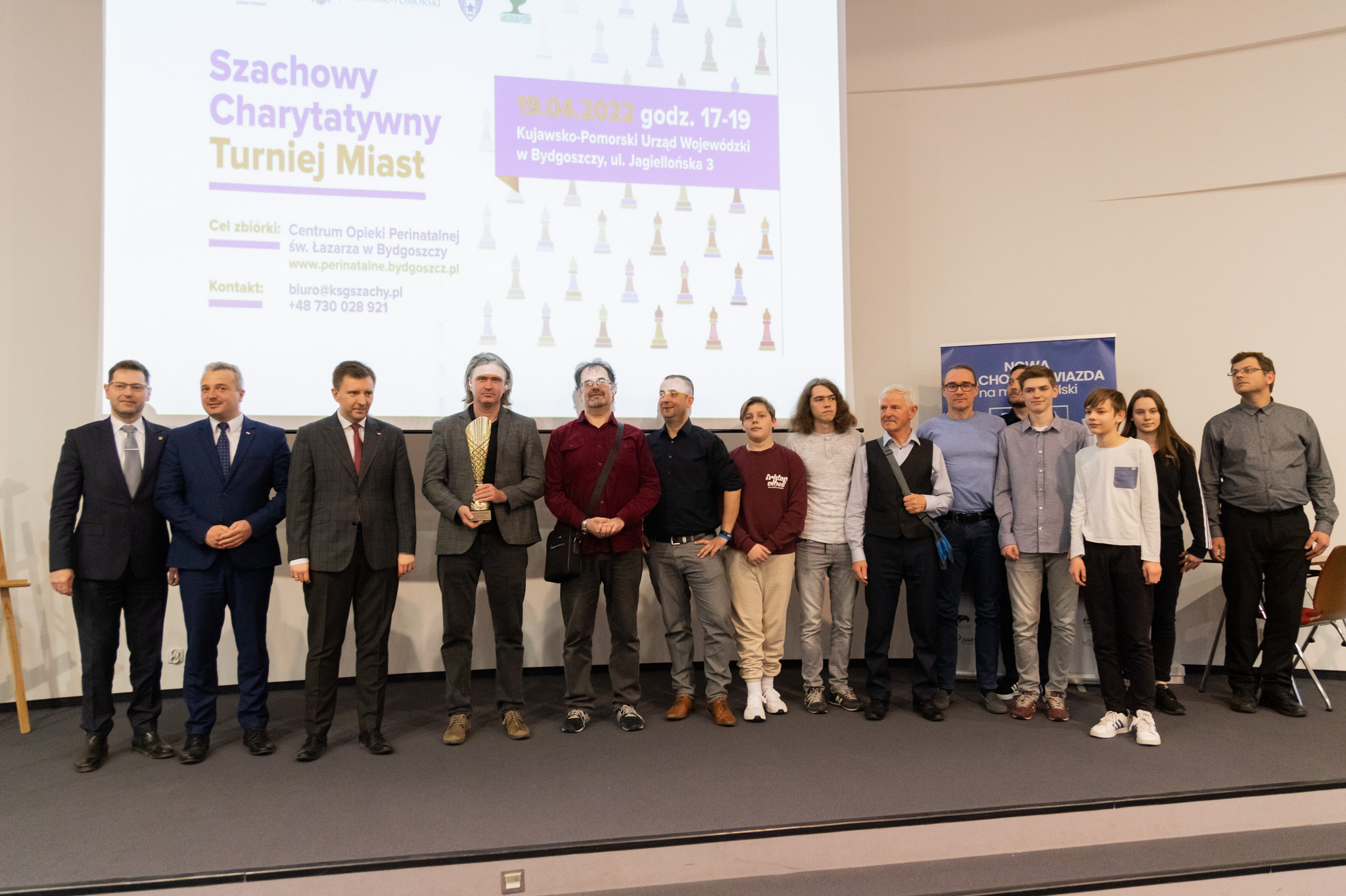 Ponad 37 tys. zł dla Centrum Opieki Perinatalnej Hospicjum Św. Łazarza w Bydgoszczy. Tyle udało się zebrać podczas pierwszego Szachowego Charytatywnego Turnieju Miast Województwa Kujawsko-Pomorskiego, zainaugurowanego w 676. urodziny Bydgoszczy przez ministra – członka Rady Ministrów Łukasza Schreibera oraz Wojewodę Mikołaja Bogdanowicza w Kujawsko-Pomorskim Urzędzie Wojewódzkim.