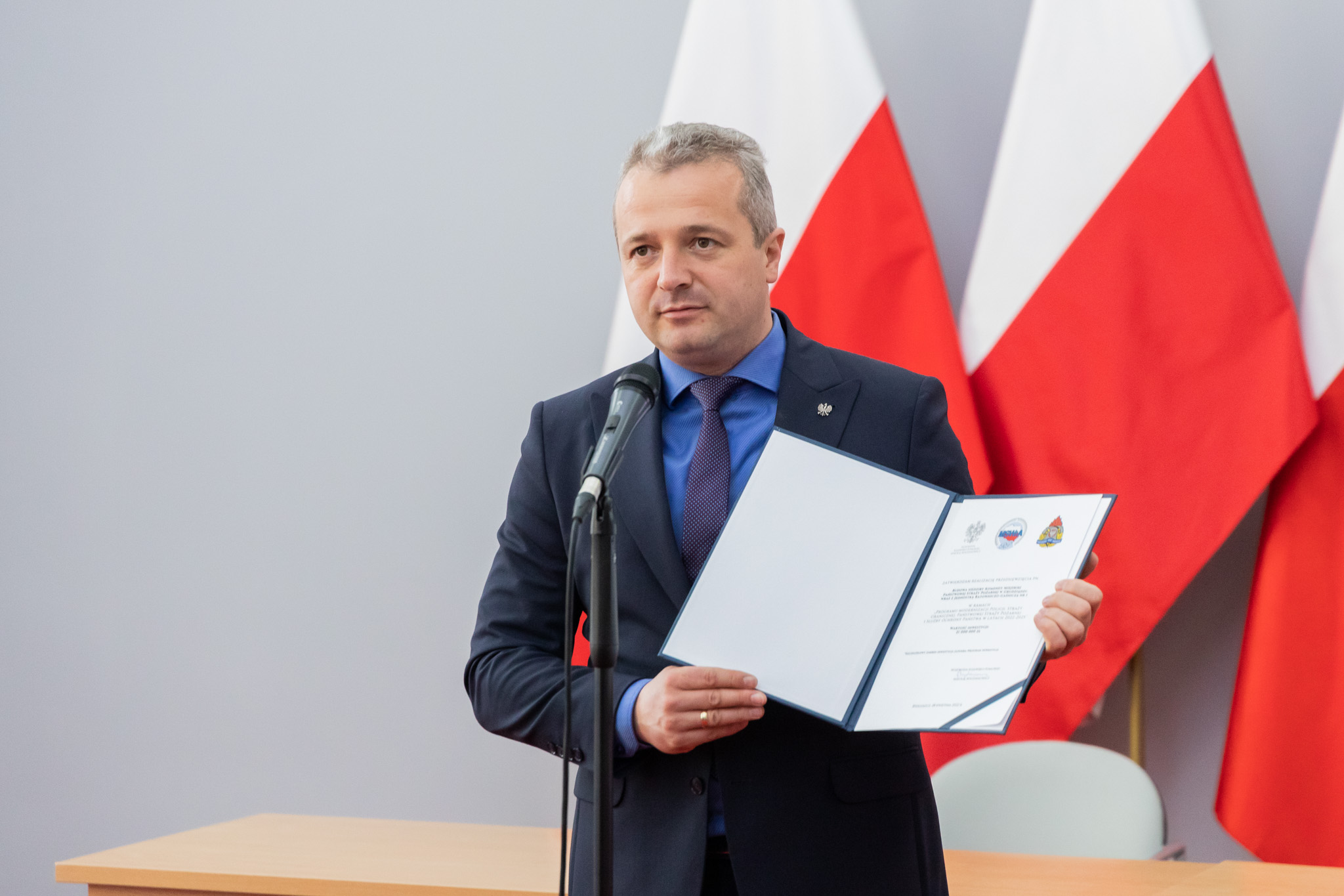 Wojewoda Mikołaj Bogdanowicz nie krył radości z możliwości przekazania zatwierdzonego projektu na budowę Komendy Miejskiej Państwowej Straży Pożarnej w Grudziądzu.