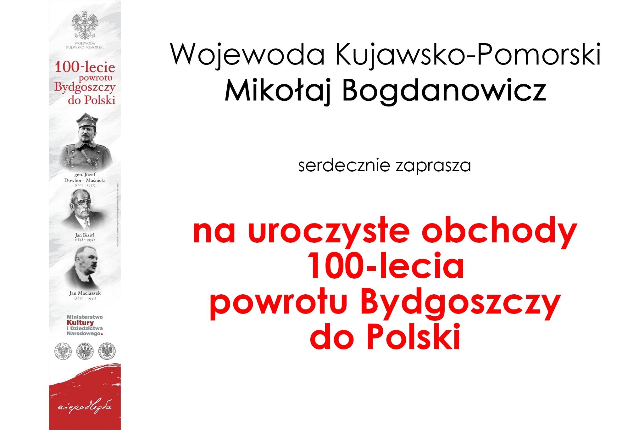 19 i 20 stycznia 2020 r. w Bydgoszczy odbędą się uroczystości 100-lecia powrotu Bydgoszczy do Polski. Wydarzenia są organizowane przez Wojewodę Kujawsko-Pomorskiego Mikołaja Bogdanowicza.
