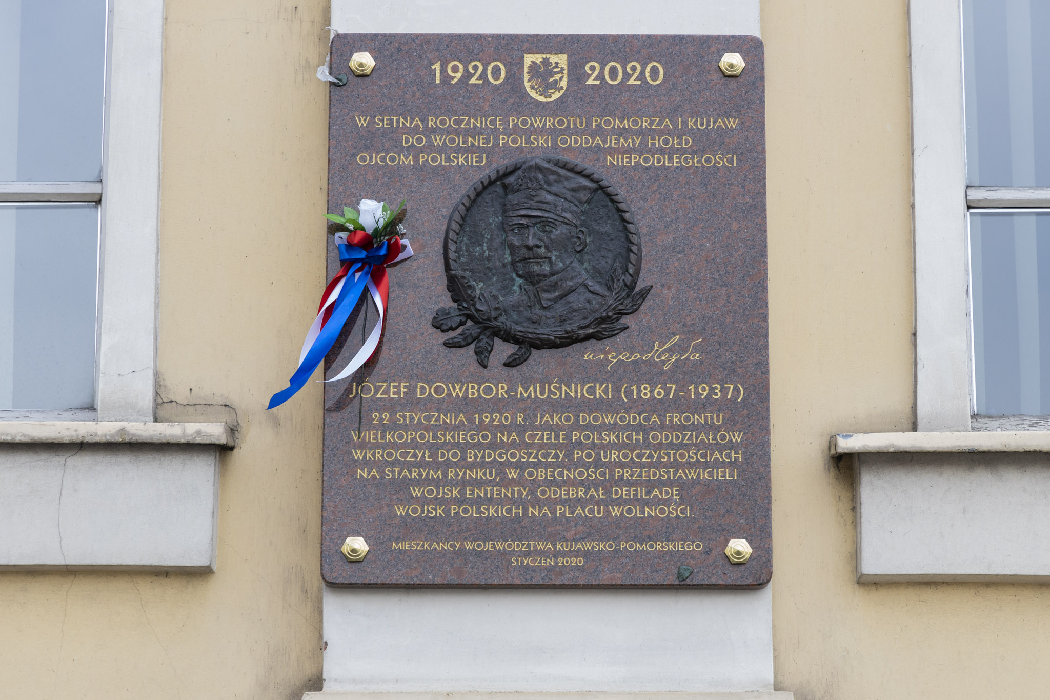 Po wernisażu uczestnicy uroczystości złożyli kwiaty pod tablicą upamiętniająca gen. Józefa Dowbor-Muśnickiego na Starym Rynku w Bydgoszczy.