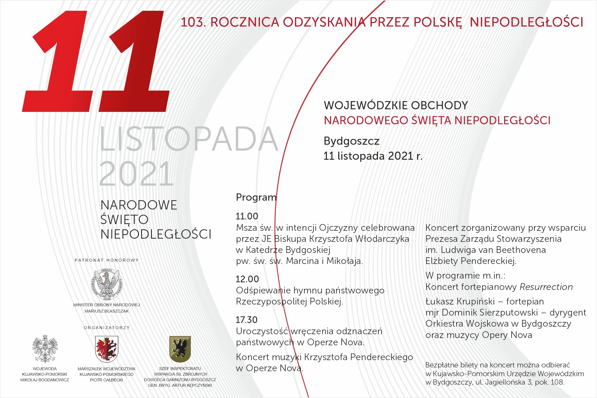 W 103. rocznicę odzyskania przez Polskę Niepodległości, 11 listopada o godz. 11.00 w Katedrze Bydgoskiej pw. św. św. Marcina i Mikołaja JE ks. bp. Krzysztof Włodarczyk będzie celebrował uroczysta Mszę św. w intencji Ojczyzny. Bezpośrednio po Eucharystii zaplanowano wspólne odśpiewanie hymnu państwowego Rzeczypospolitej Polskiej. O godz. 17.30 w Operze Nova odbędzie się uroczystość wręczenia odznaczeń państwowych oraz koncert muzyki Krzysztofa Pendereckiego.