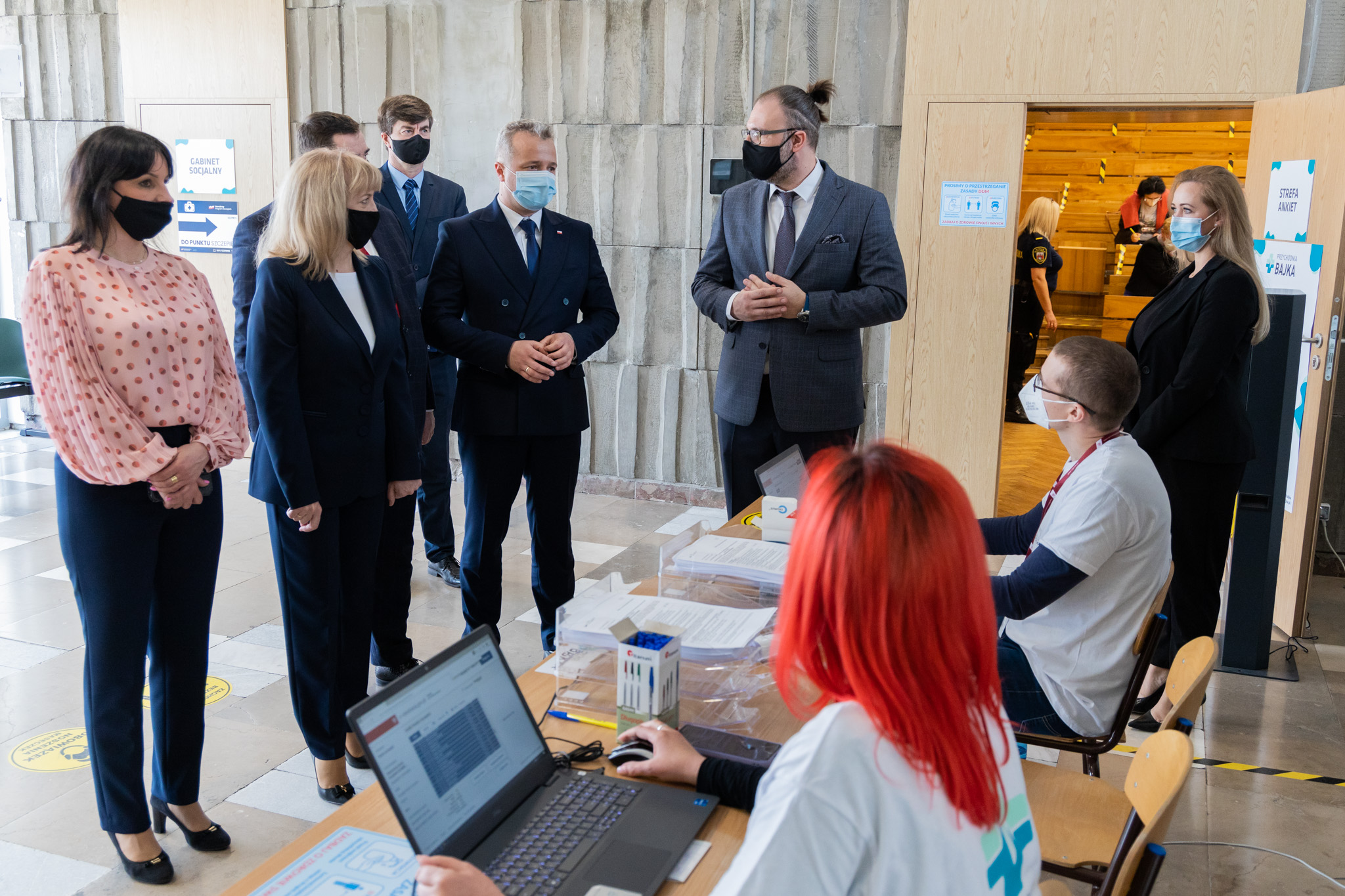 Wszyscy pacjenci wchodzą do tego punktu jedną stroną. Mają do dyspozycji aulę, w której jest możliwość poczekania na szczepienie, dalej czekają zespoły szczepienne. Kolejną strefą jest poczekalnia po szczepieniu i kolejna aula, w której można spędzić czas po szczepieniu, aby można było bezpiecznie wrócić do domu