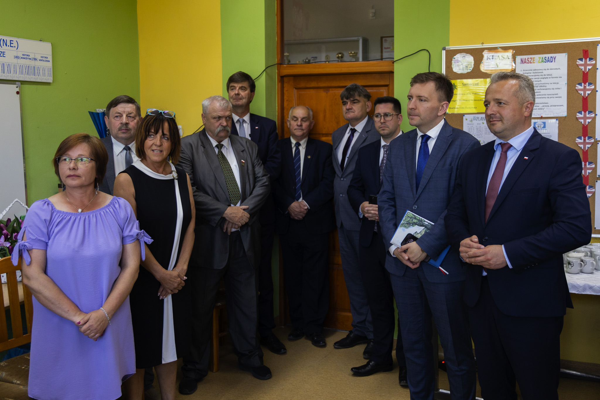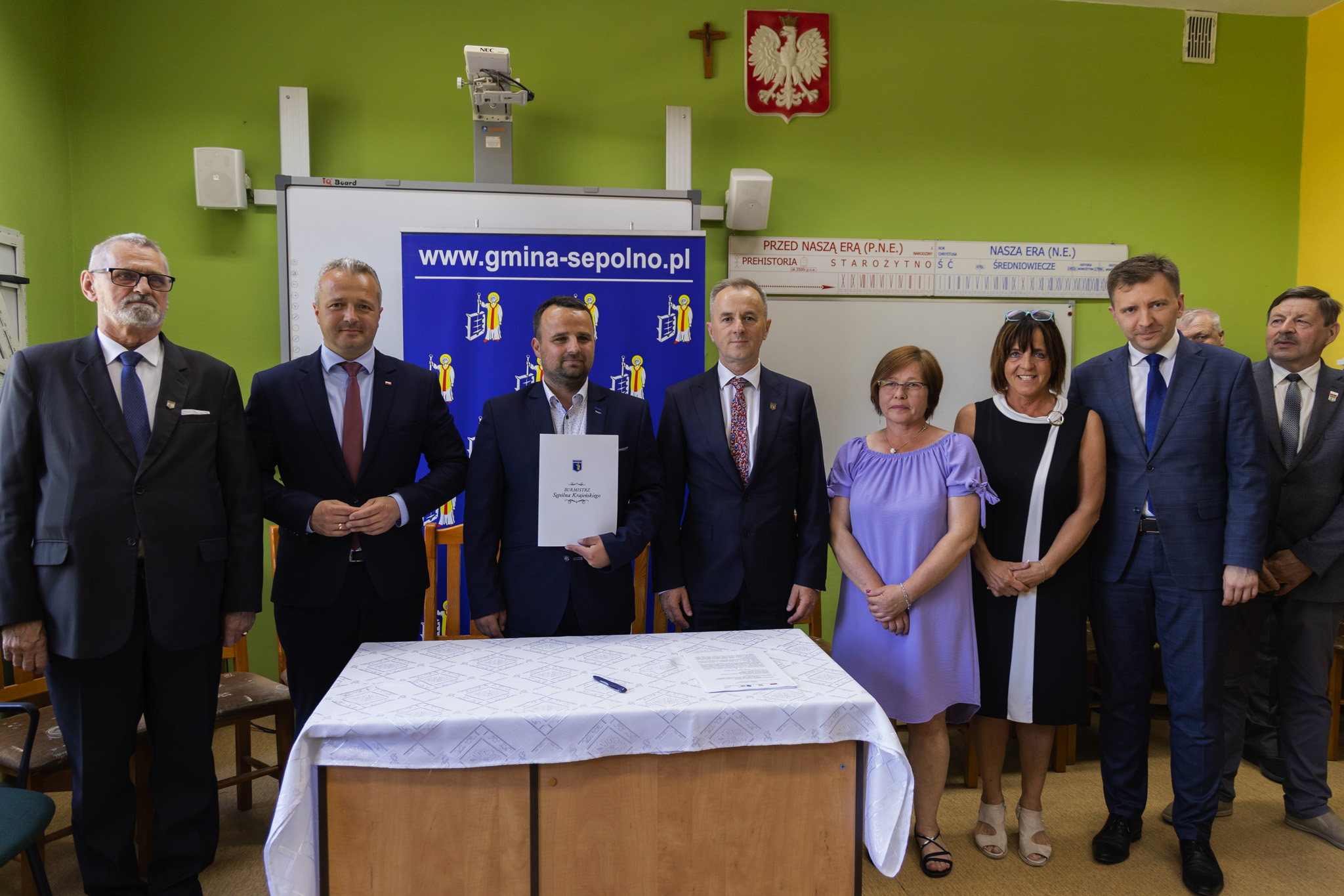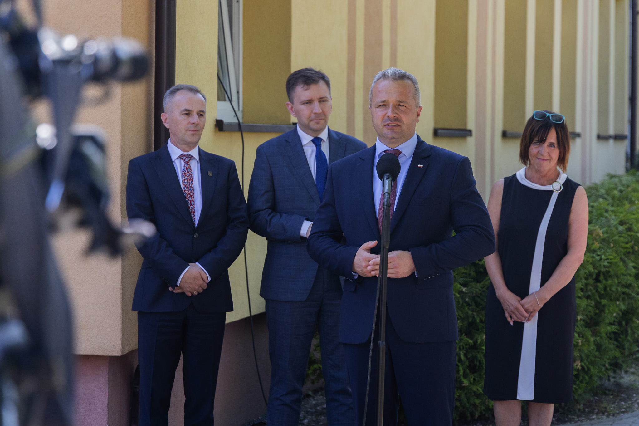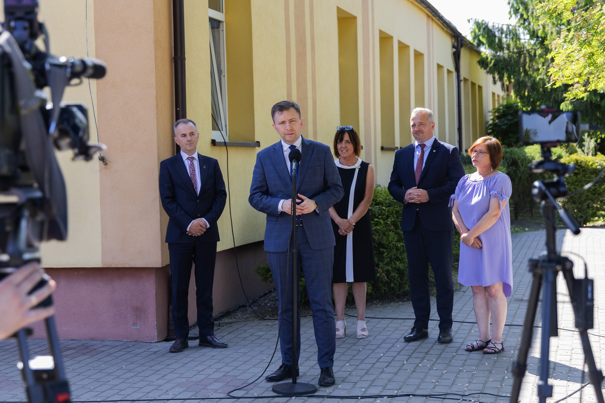 W konferencji prasowej udział wzięli minister-członek Rady Ministrów Łukasz Schreiber, wojewoda Mikołaj Bogdanowicz, Burmistrz Sępólna Krajeńskiego Waldemar Stupałkowski, Sołtys Sołectwa Zboże Lidia Szopińska i Dyrektor Szkoły w Zbożu Ewa Śliwińska.